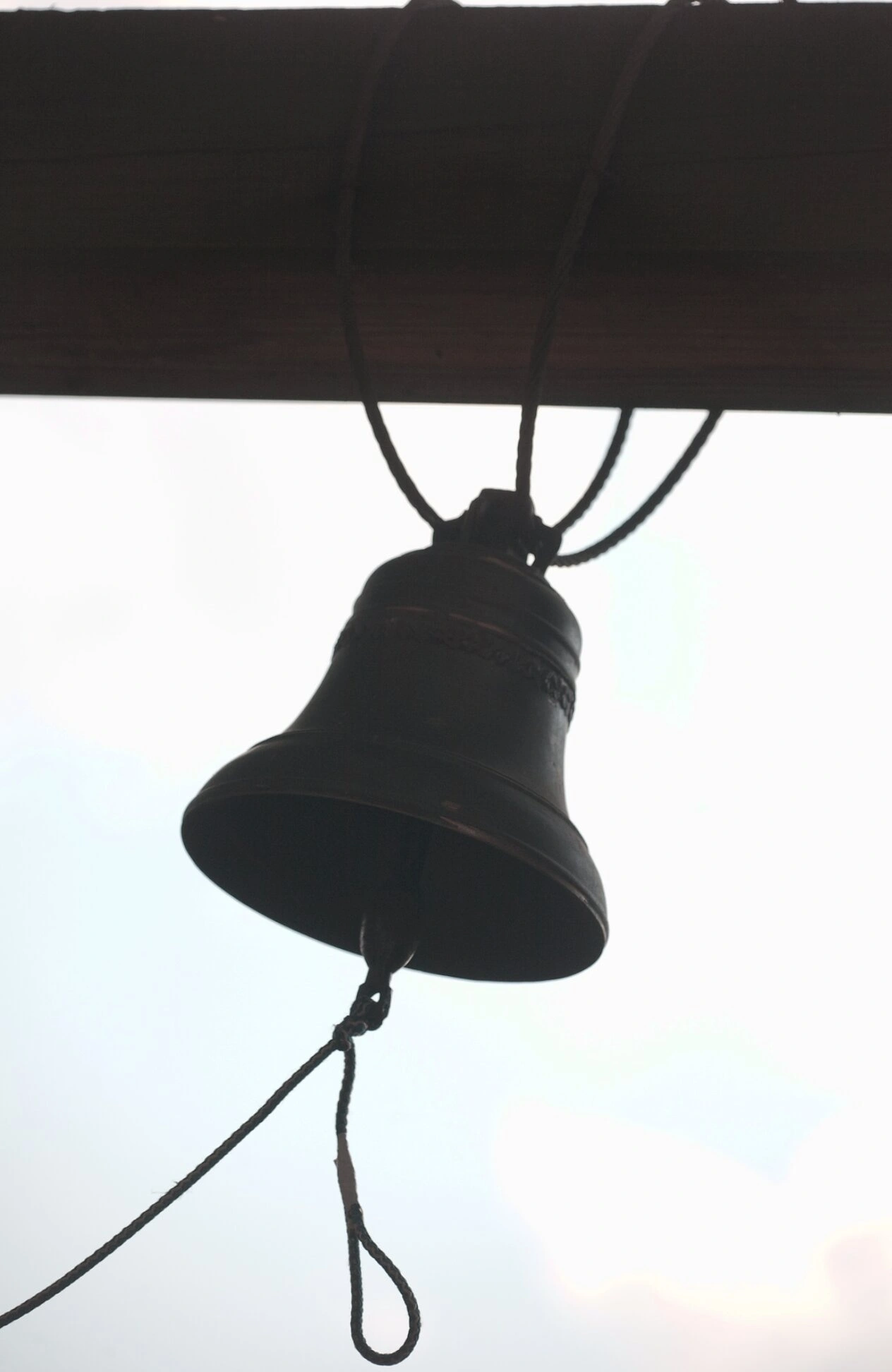 Особого внимания заслуживает язык колокола, который заканчивается специальной петлей из веревки. Такое конструктивное решение характерно для традиционных православных колоколов и предназначено для осуществления церковного звона во время богослужений и праздников. На заднем плане фотографии просматривается светлый фон, создающий выразительный контраст с темным силуэтом колокола и подвесной конструкции.