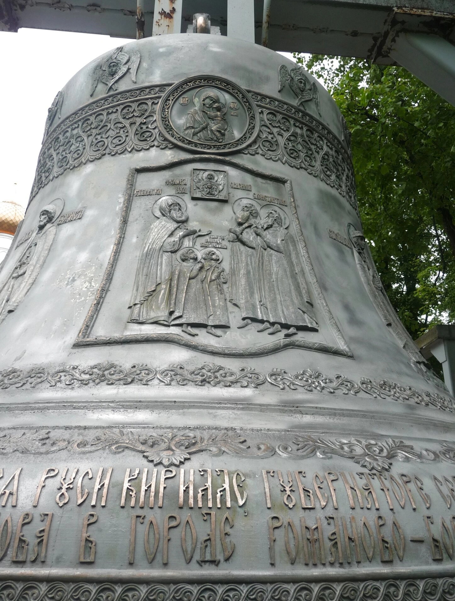 На представленной фотографии запечатлен один из колоколов Успенского кафедрального собора города Ярославля, являющийся выдающимся памятником церковного литейного искусства. Колокол отличается богатым убранством и символическими изображениями, характерными для православной традиции.