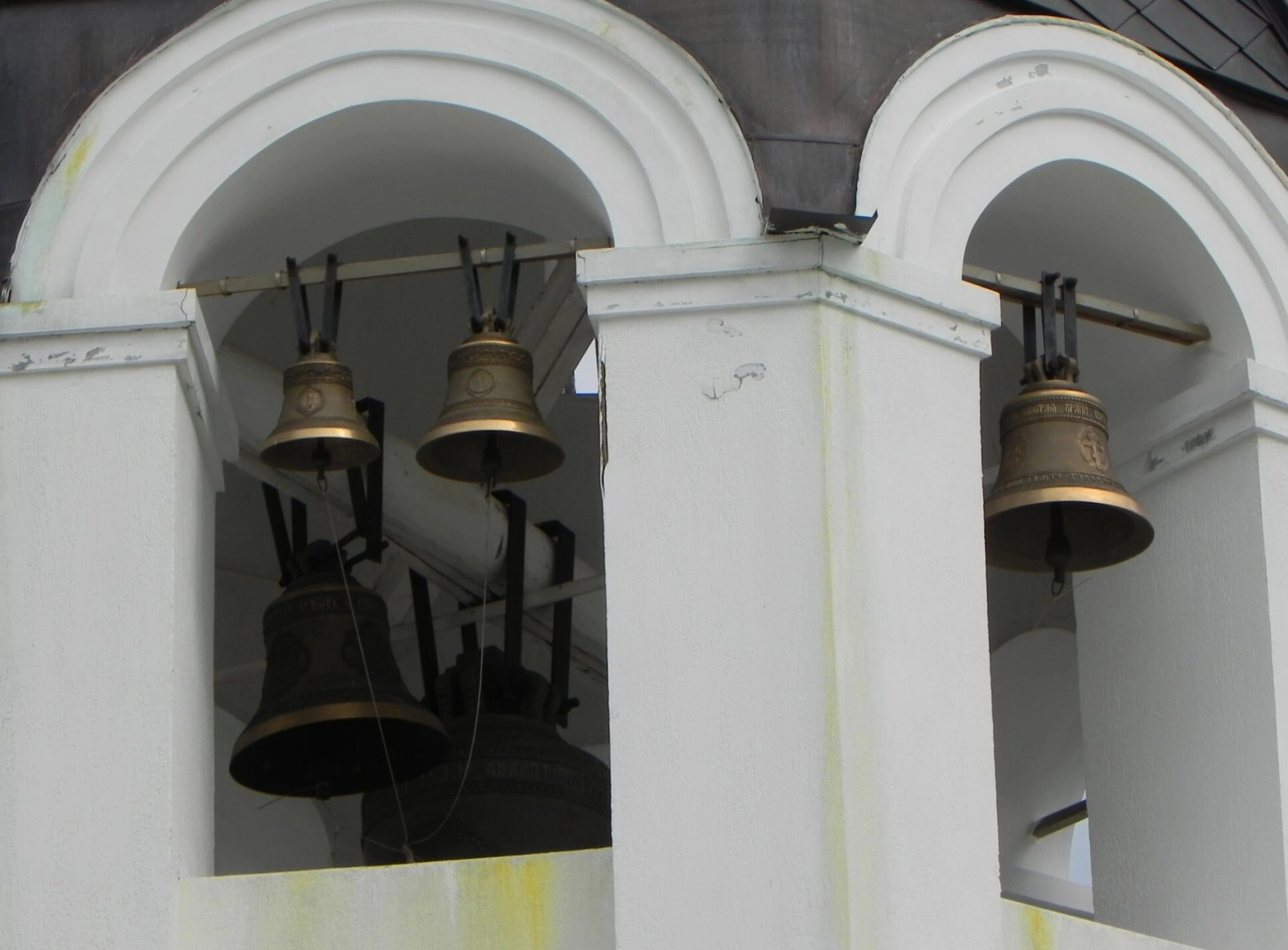 Колокольный звон на Руси испокон веков созывал верующих на молитву, оповещал о важнейших моментах богослужения и отмечал великие церковные праздники. Каждый колокол обладает своим уникальным голосом, образуя в совокупности стройную систему – благовест. На фотографии видны несколько разновеликих колоколов, традиционно подвешенных в арочных проёмах яруса звона.