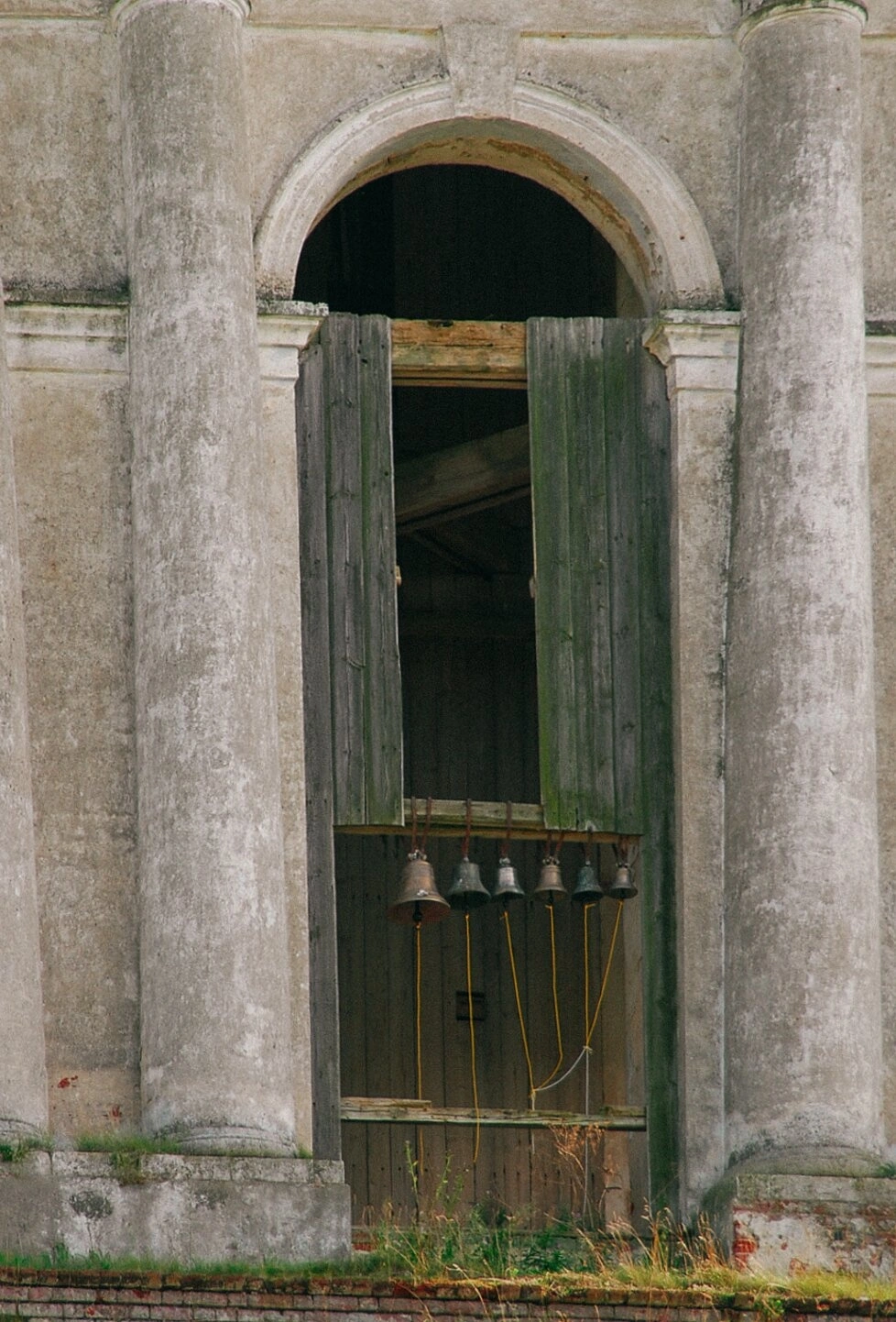 Из глубины проёма свисают на верёвках церковные колокола разного размера, предназначенные для созыва верующих на богослужение и возвещения важнейших моментов церковной службы. Их матовые поверхности говорят о многолетнем использовании в молитвенных целях. Массивные каменные колонны, обрамляющие арку, и кирпичная кладка в нижней части свидетельствуют о солидном возрасте постройки и традициях церковного зодчества.