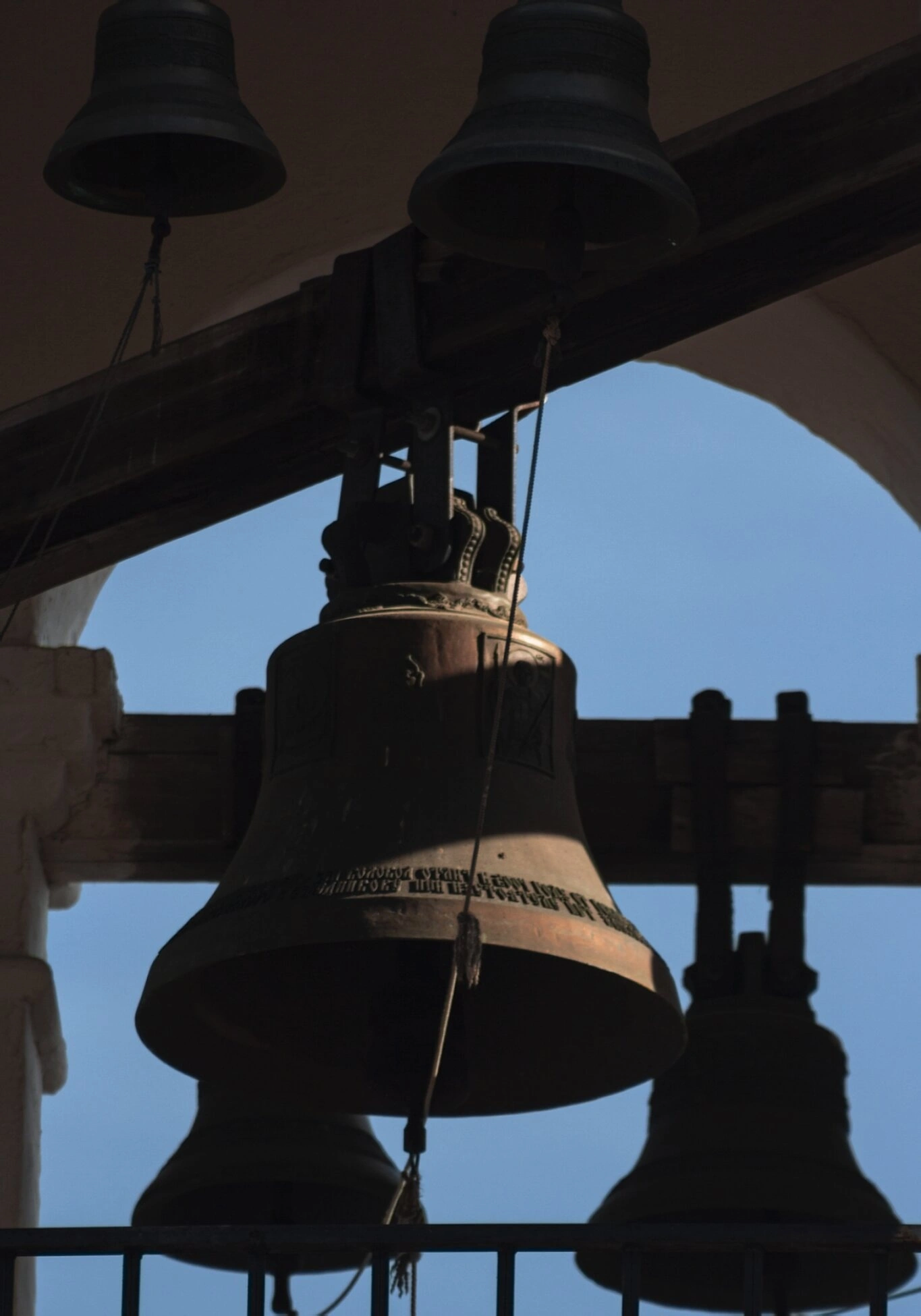 На заднем плане и по сторонам виднеются другие колокола, составляющие единый ансамбль звона. Через арочные проёмы колокольни просвечивает чистое голубое небо, что создаёт ощущение лёгкости и духовного возвышения. Колокольный звон испокон веков является неотъемлемой частью православного богослужения, созывая верующих на молитву и возвещая о великих церковных праздниках.
