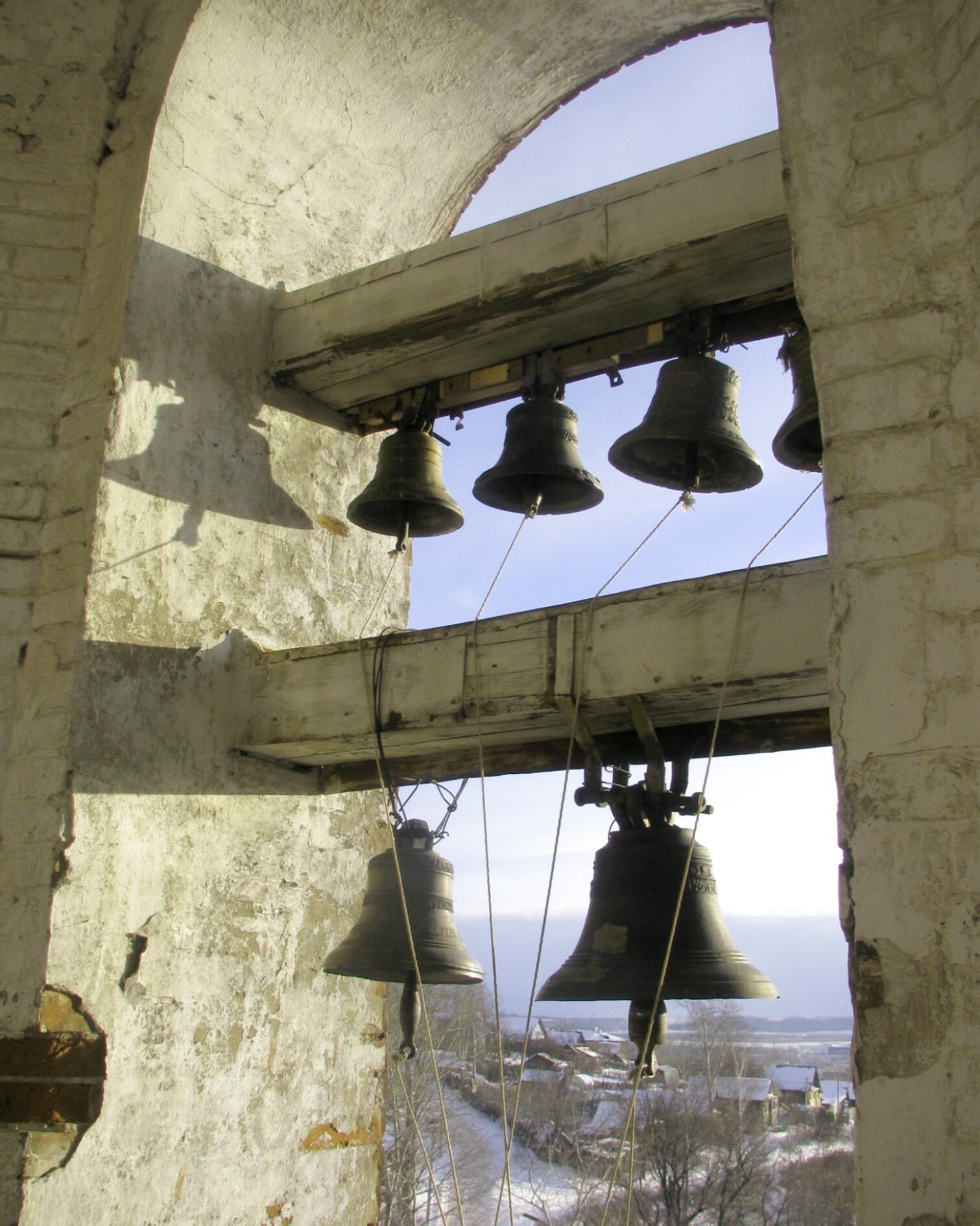 Через арочные проёмы колокольни открывается вид на зимний пейзаж православного храмового комплекса. Заснеженные деревья и церковные строения создают гармоничный фон для этого святого места. Колокольня, являясь неотъемлемой частью церковной архитектуры, выполняет важную функцию в духовной жизни прихода – её колокола созывают верующих на молитву и возвещают о важнейших моментах богослужения.