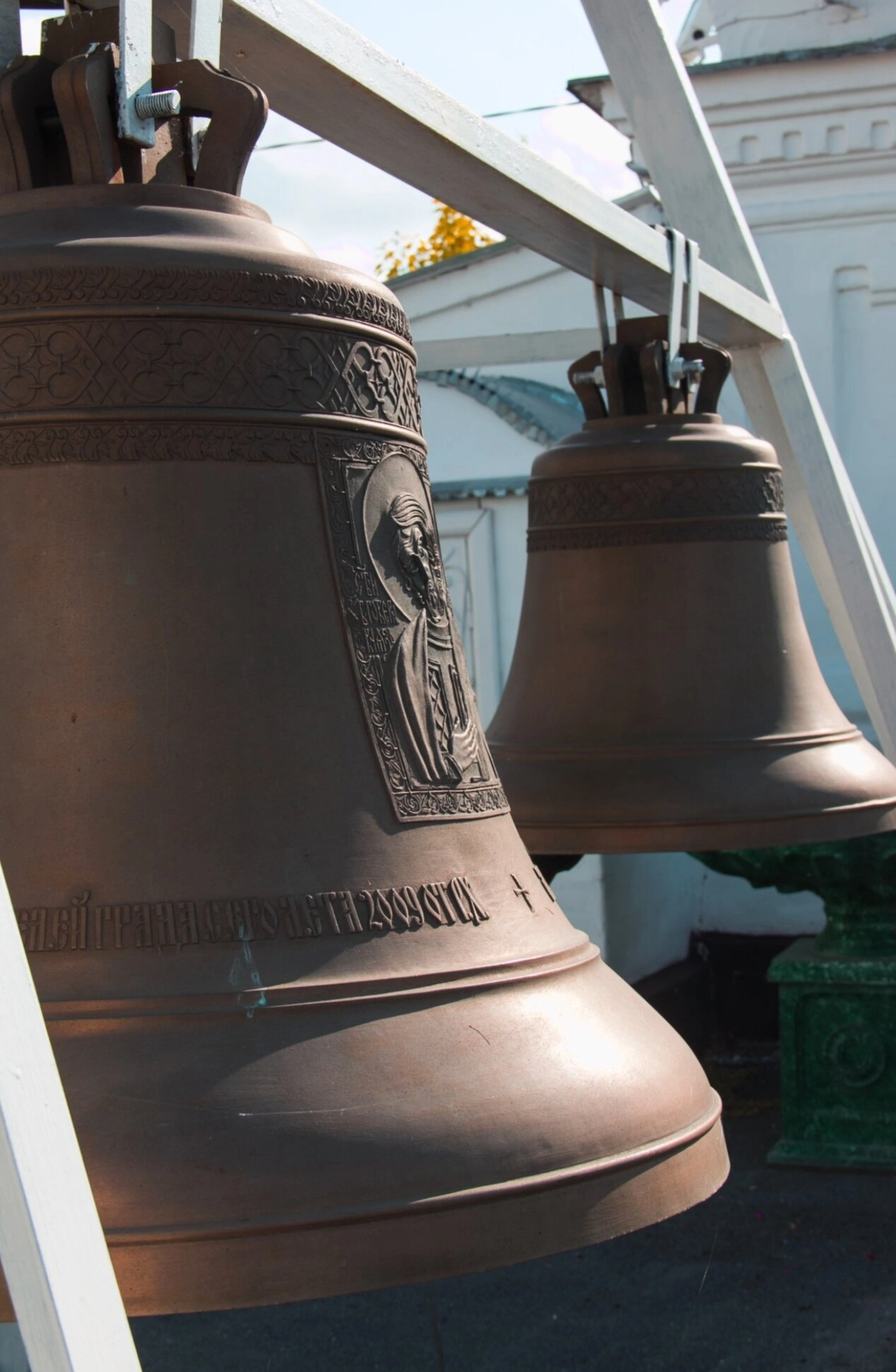 На представленной фотографии запечатлены два больших бронзовых колокола, размещённые на ярусе звона колокольни Свято-Никольского храма в городе Ишиме Тюменской области. Колокола подвешены на мощной металлической конструкции, предназначенной для их надёжного крепления и оптимального распространения благого звона.