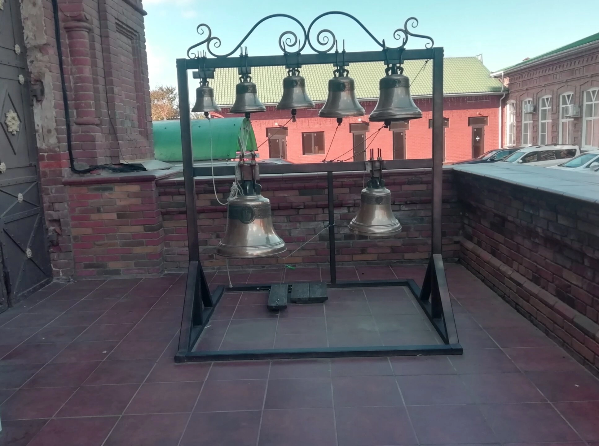 На представленной фотографии запечатлён набор церковных колоколов, размещённых на прочной металлической конструкции у входа в Свято-Троицкий собор города Краснодара. Колокола различного размера, от малых до больших, предназначены для совершения богослужебных звонов, созывающих верующих на молитву и возвещающих о важнейших моментах церковной службы.