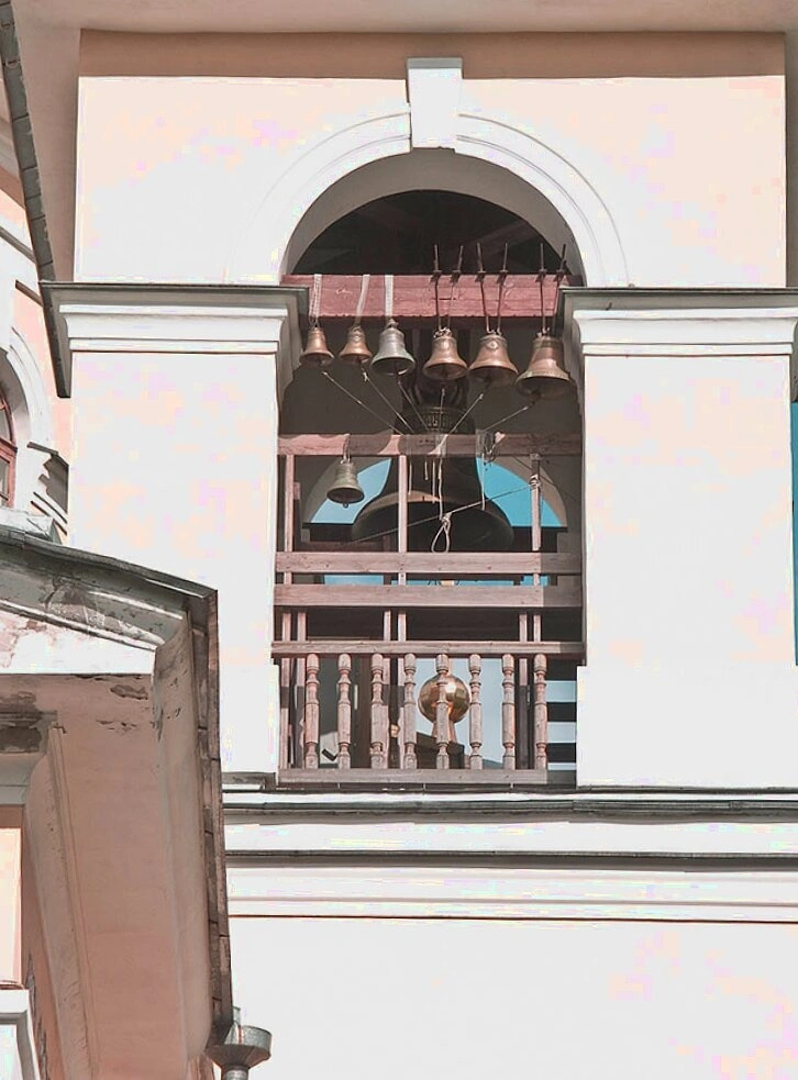 Колокола, видимые на снимке, являются неотъемлемой частью духовной жизни храма. Их благозвучный перезвон разносится над округой, освящая молитвой городское пространство. Нижняя часть арочного проёма оборудована деревянными ограждениями, обеспечивающими безопасность звонарей во время исполнения их послушания.