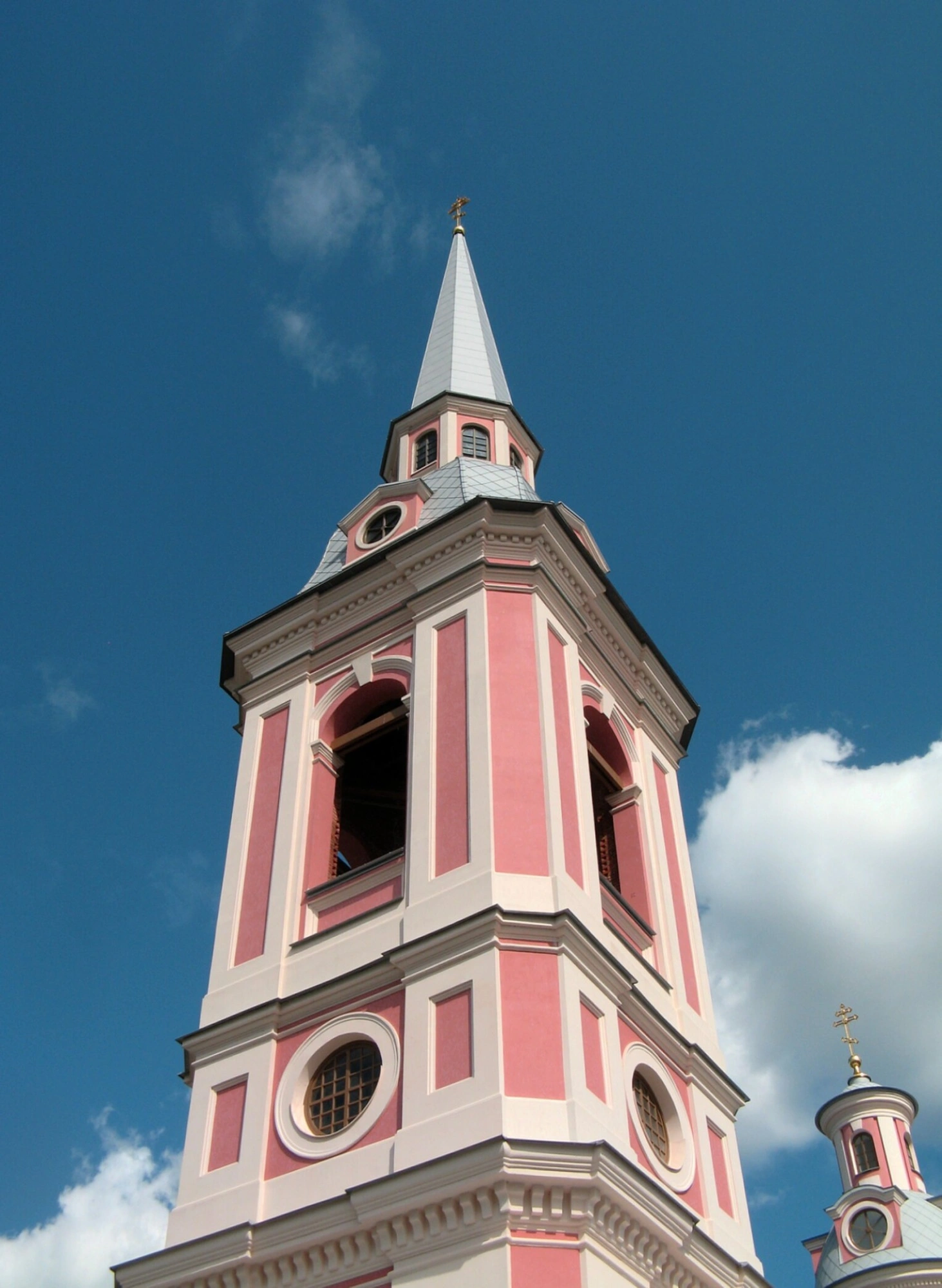 Колокольня, устремлённая ввысь своим остроконечным золочёным шпилем, увенчанным православным крестом, представляет собой яркий образец церковного зодчества. Она выполнена в традиционной для русского храмового строительства цветовой гамме: сочетание розового основания и белоснежных декоративных элементов создаёт нарядный и торжественный облик. Ярус звона прорезают арочные проёмы, предназначенные для церковных колоколов, чей благовест некогда разносился над акваторией Невы и Ладожского озера. Ниже расположен ярус с характерными для елизаветинского барокко круглыми окнами-люкарнами, украшенными скромным лепным декором.