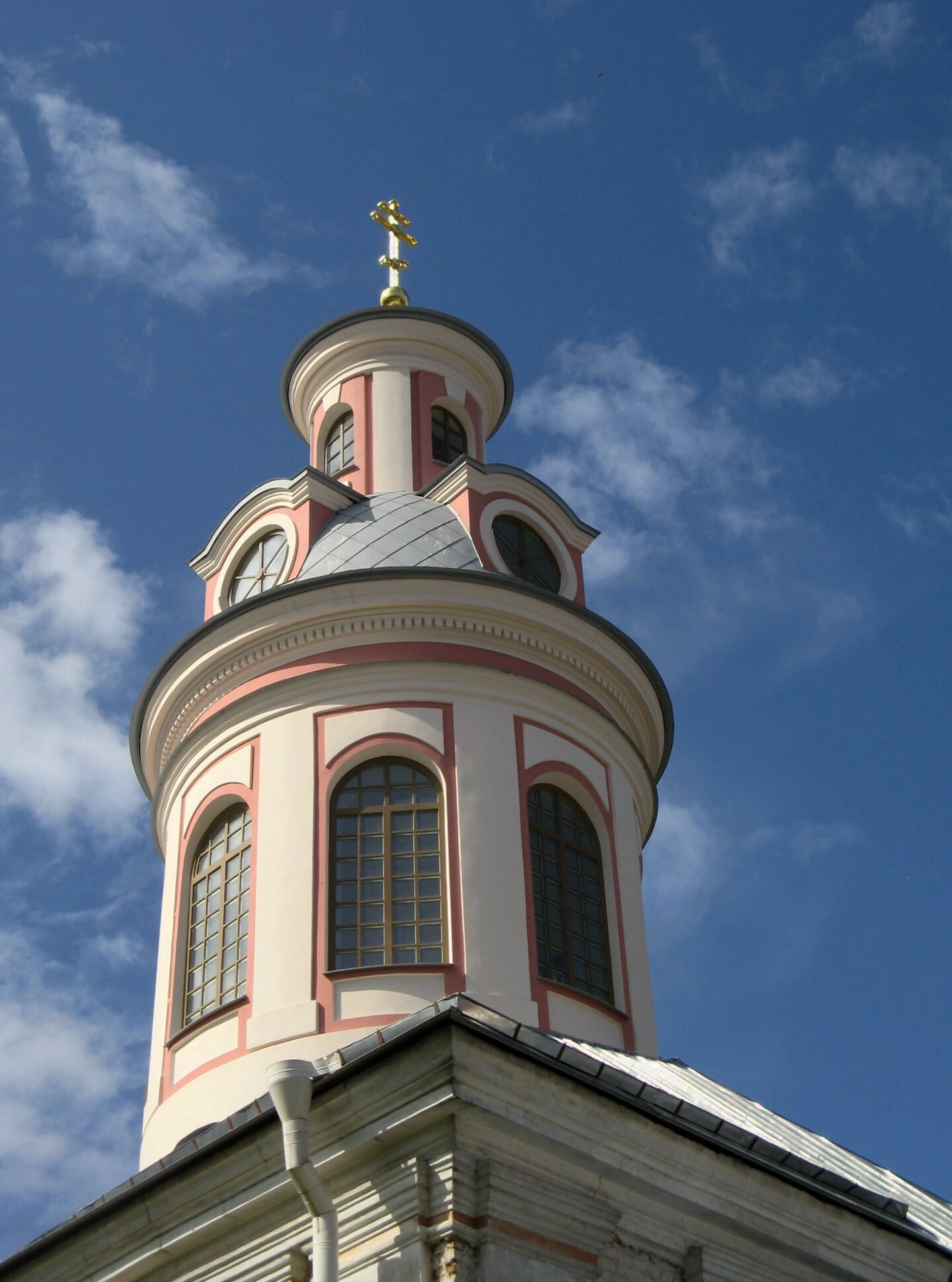 Колокольня, увенчанная золочёным куполом и сияющим крестом, устремляется ввысь, символизируя молитвенное предстояние перед Господом. Её ярусы украшены арочными проёмами, в которых размещаются церковные колокола, призывающие верующих на богослужение своим благозвучным звоном. Фасад украшают декоративные элементы и карнизы, характерные для русской церковной архитектуры, что придаёт постройке особую торжественность и благолепие.