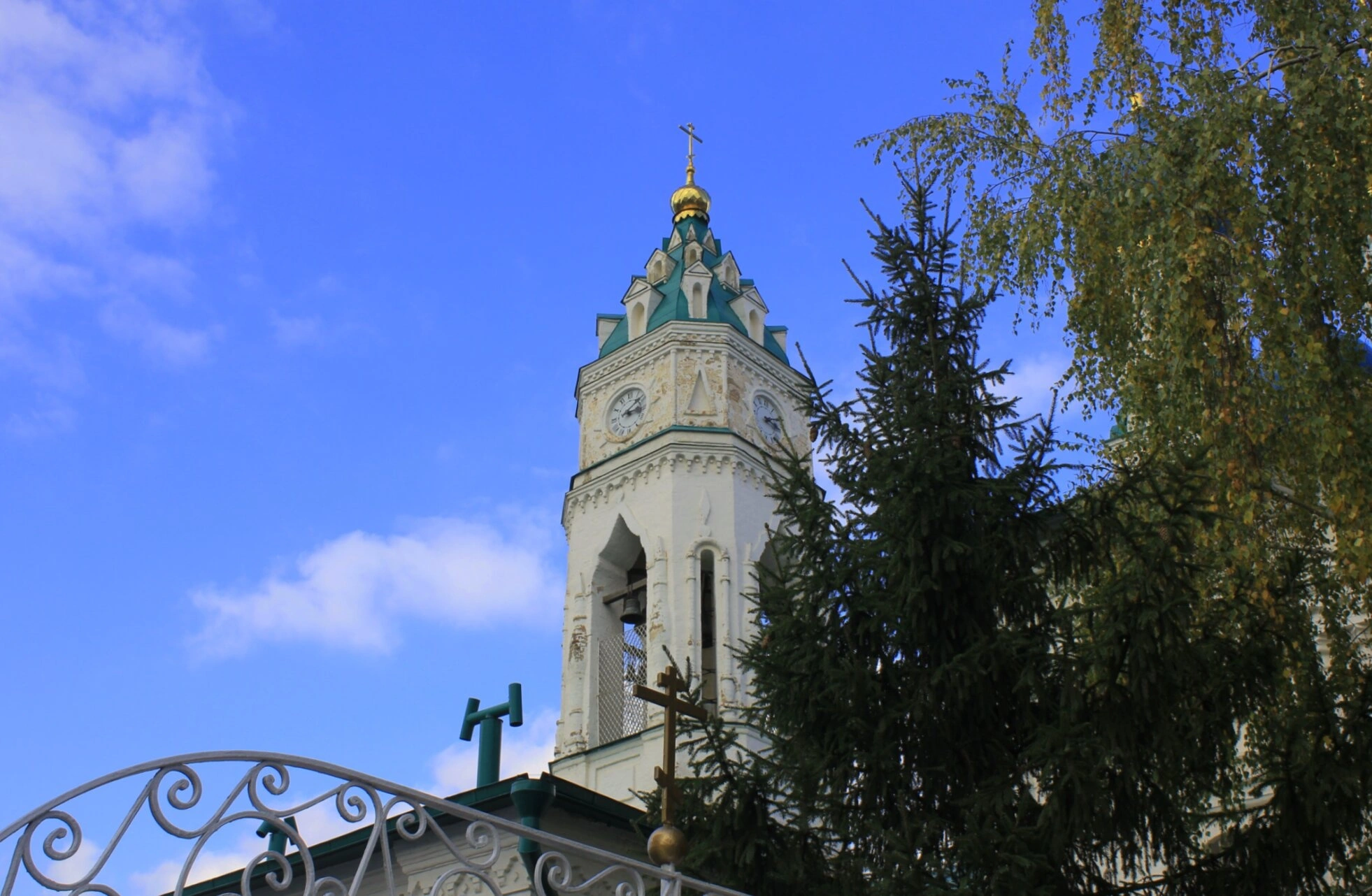 По сторонам от каменной красавицы виднеются ветви деревьев — хвойного и лиственного, что символично напоминает о единении всего творения в прославлении Творца. Чугунное ограждение с декоративными элементами подчёркивает благолепие и ухоженность святого места.