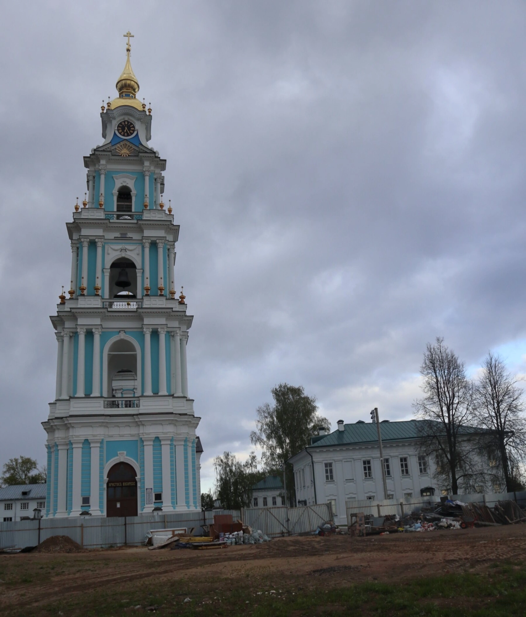 На представленной фотографии запечатлена величественная колокольня Богоявленского собора, являвшегося центральным храмом несохранившегося до наших дней Костромского кремля. Многоярусное сооружение, увенчанное куполом со златоглавой главкой и православным крестом, гордо возносится в небо, демонстрируя торжество духа и веры.