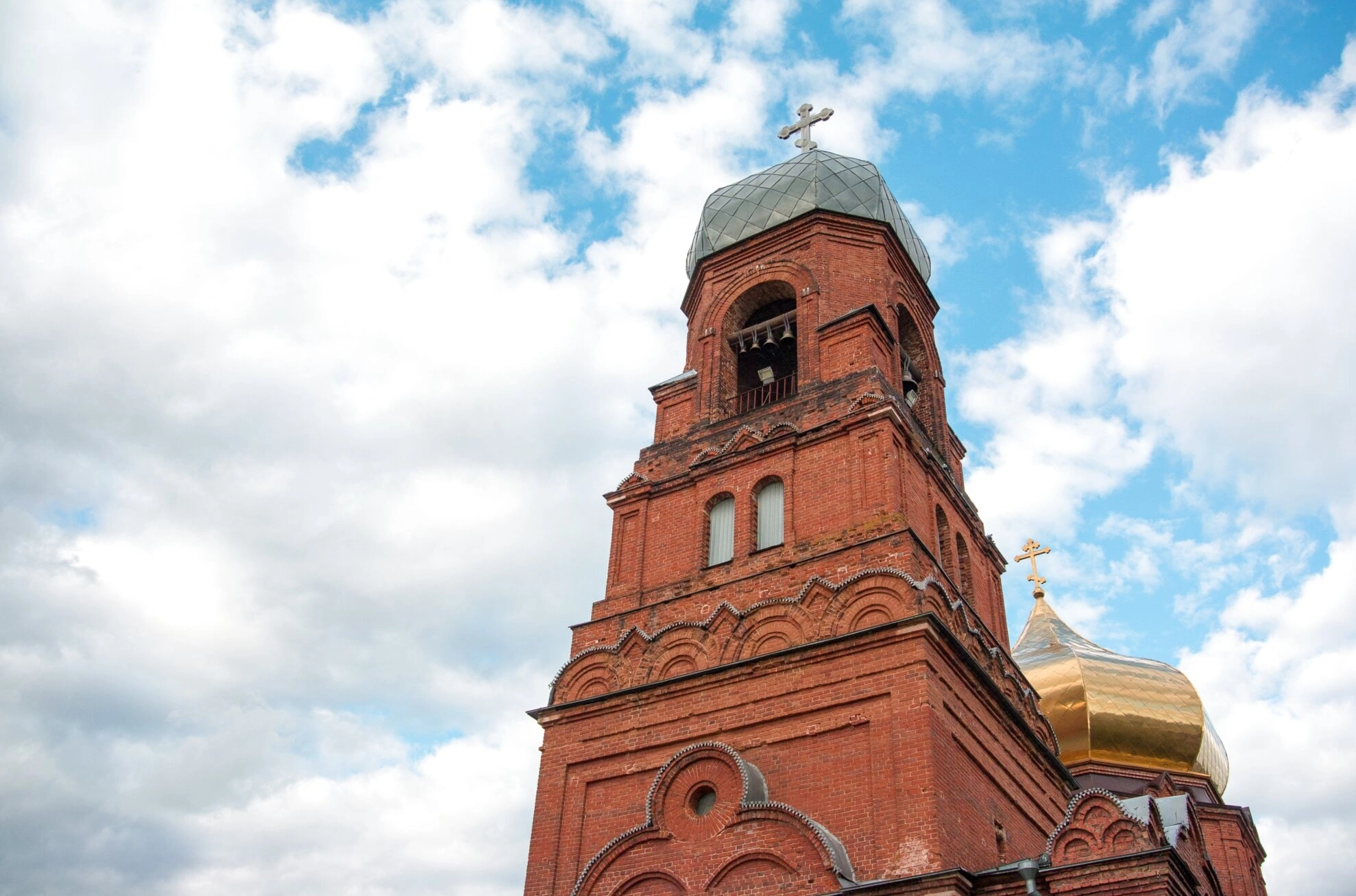 Справа от колокольни виден фрагмент одного из главных куполов самого храма, покрытый золотом и также увенчанный крестом. Эта деталь позволяет судить о масштабах и великолепии всего храмового комплекса, который, к великому сожалению, не сохранился до наших дней. Богоявленская церковь в Курумоче была важным духовным центром для жителей всего региона и ярким памятником церковной архитектуры своего времени.