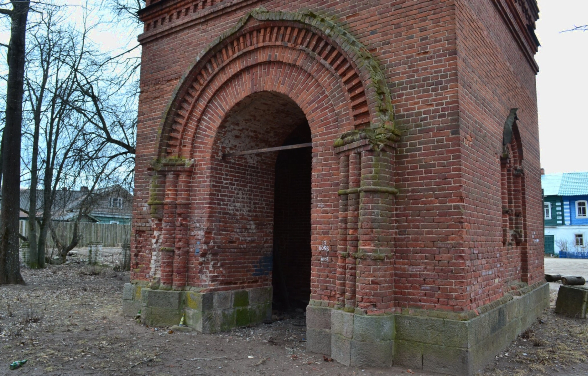 Окружает памятник православной архитектуры скромный сельский пейзаж: земля, покрытая опавшими листьями, и голые деревья, что создаёт атмосферу тихого воспоминания о былом. На заднем плане виднеются скромные деревенские строения, подчёркивающие исторический контекст места.