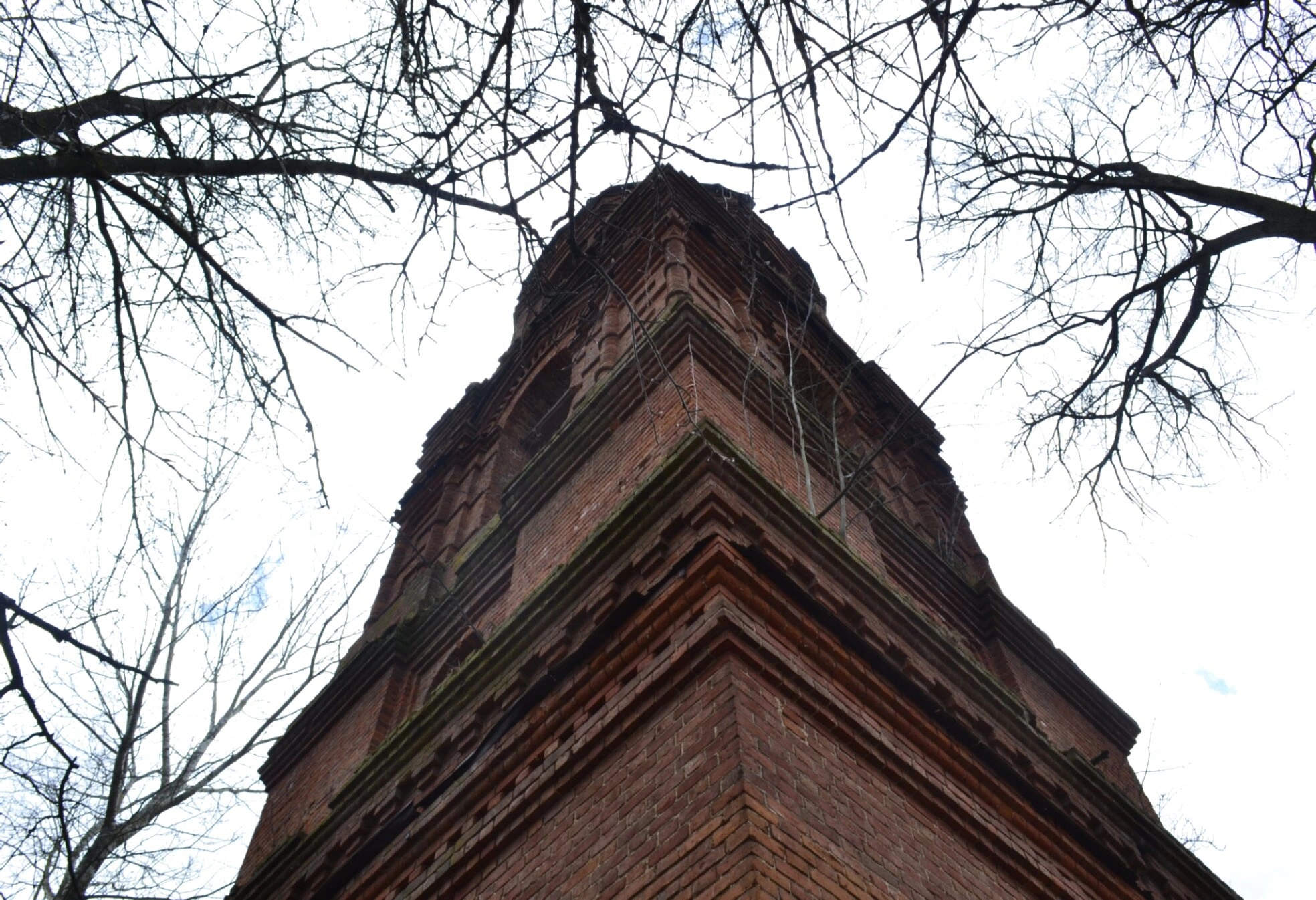 Кирпичная кладка, чёткость линий и ярусная композиция сооружения демонстрируют высокий уровень строительного мастерства того времени. Голые ветви деревьев на фоне светлого неба, окружающие колокольню, добавляют кадру особое настроение, напоминая о бренности земного и вечности духовного. Ныне этот архитектурный памятник, сохранившийся несмотря на годы запустения в советский период, является объектом культурного наследия и свидетельством былого величия православной веры на тверской земле.