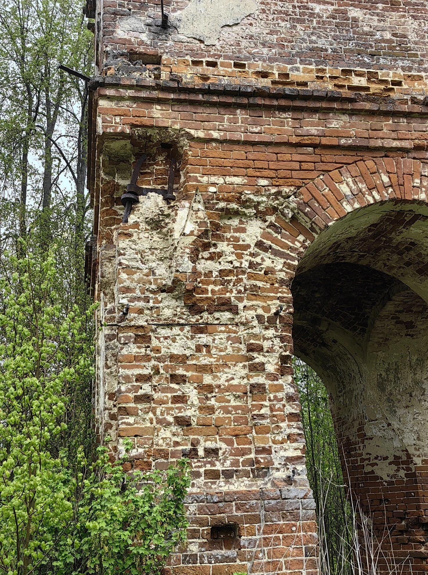 В верхней части стены, в специальной нише, сохранились два металлических элемента, напоминающих кованые болты или крепления, ныне частично покрытые ржавчиной. С правой стороны композиции возвышается монументальная кирпичная арка полукруглой формы, составляющая часть прежде величественного церковного проёма.
