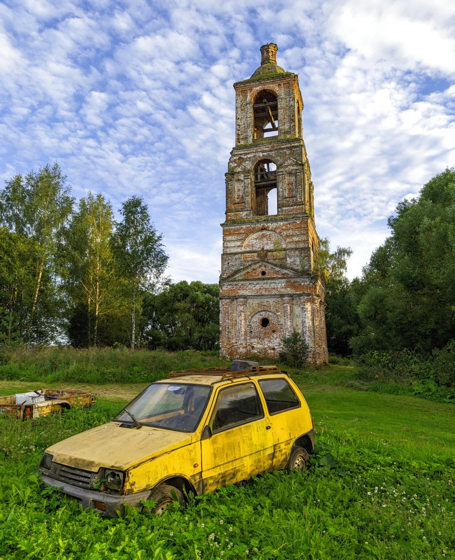На переднем плане фотографии виден старый автомобиль марки «Ока», стоящий в высокой траве. Его потрёпанный вид и ржавчина символически отражают общее состояние забвения, в котором пребывает этот священный уголок русской земли. Жёлтый цвет автомобиля контрастирует с кирпичной кладкой колокольни, создавая меланхоличное настроение увядания и временности земного.
