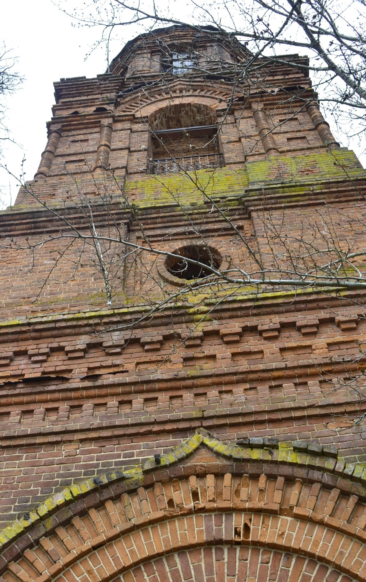 Колокольня, изображённая на снимке, выполнена из красного кирпича и демонстрирует характерные для конца XIX — начала XX века архитектурные приёмы. Её ярусная композиция, арочные проёмы звона и лаконичный декор свидетельствуют о традициях позднего классицизма с элементами эклектики. Снимок сделан в зимний период, что подчёркивает монументальность и величие сооружения на фоне окружающего пейзажа.