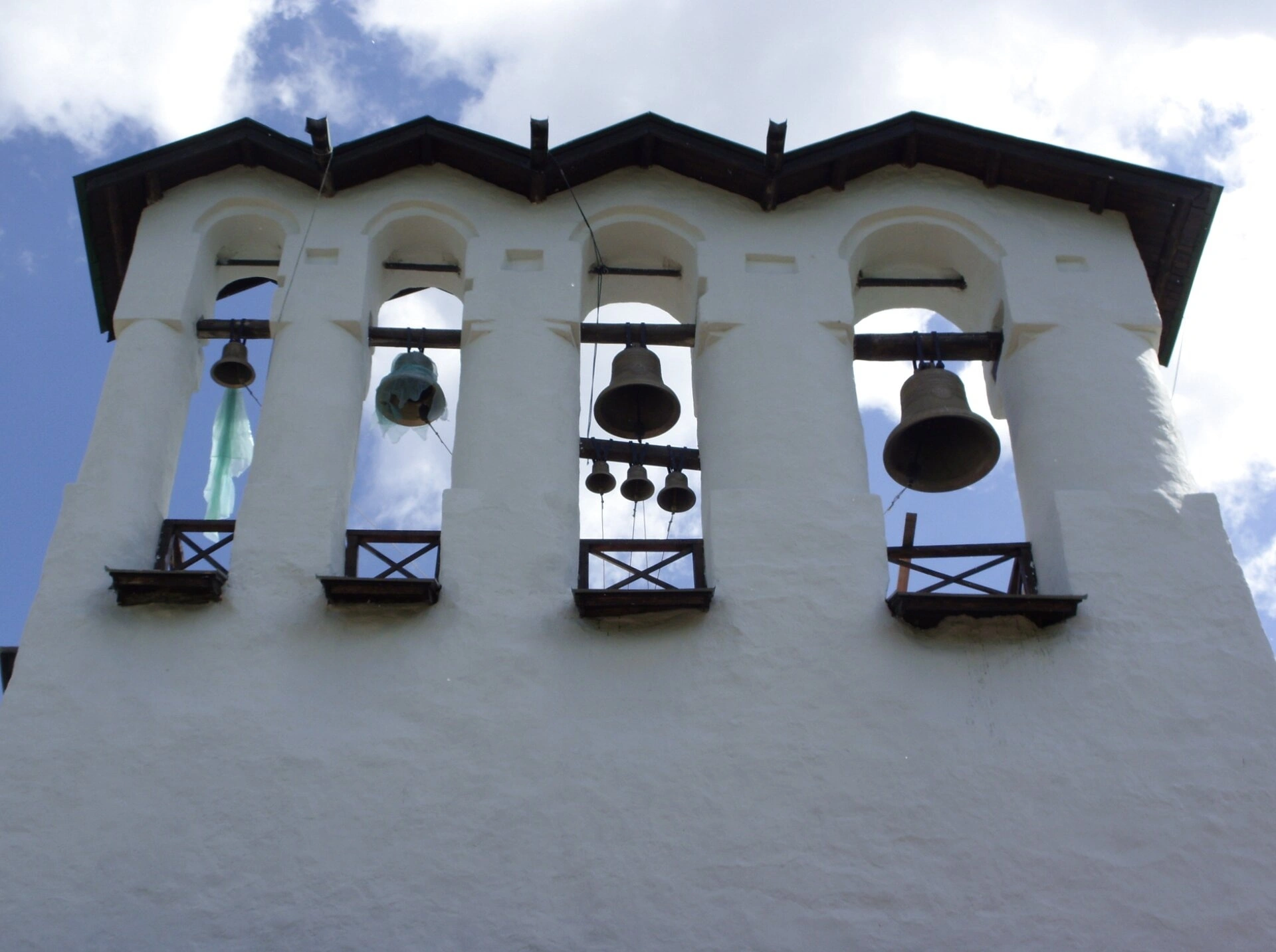 На заднем плане фотографии видно голубое небо с легкими облаками, что подчеркивает высоту и устремлённость колокольни ввысь, к горнему миру. Отсутствие людей на снимке позволяет сосредоточить внимание на архитектурных деталях и духовном значении этого святого места.