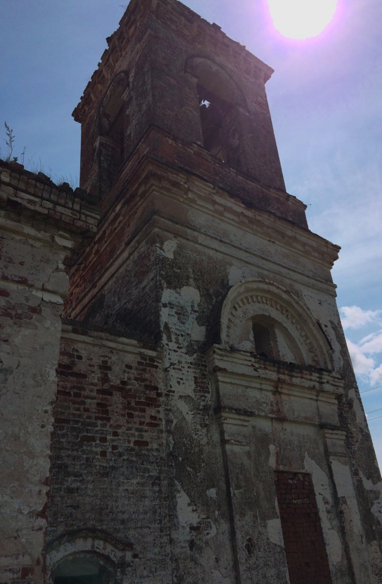 Фотография сделана в светлый солнечный день, когда лучи освещают остатки былого величия этой святыни. Яркое солнце в верхней части кадра создаёт глубокие тени на поверхности стен, подчёркивая рельеф кладки и повреждения конструкции. На фоне голубого неба с редкими облаками силуэт колокольни выглядит особенно пронзительно, напоминая о быстротечности земного бытия.
