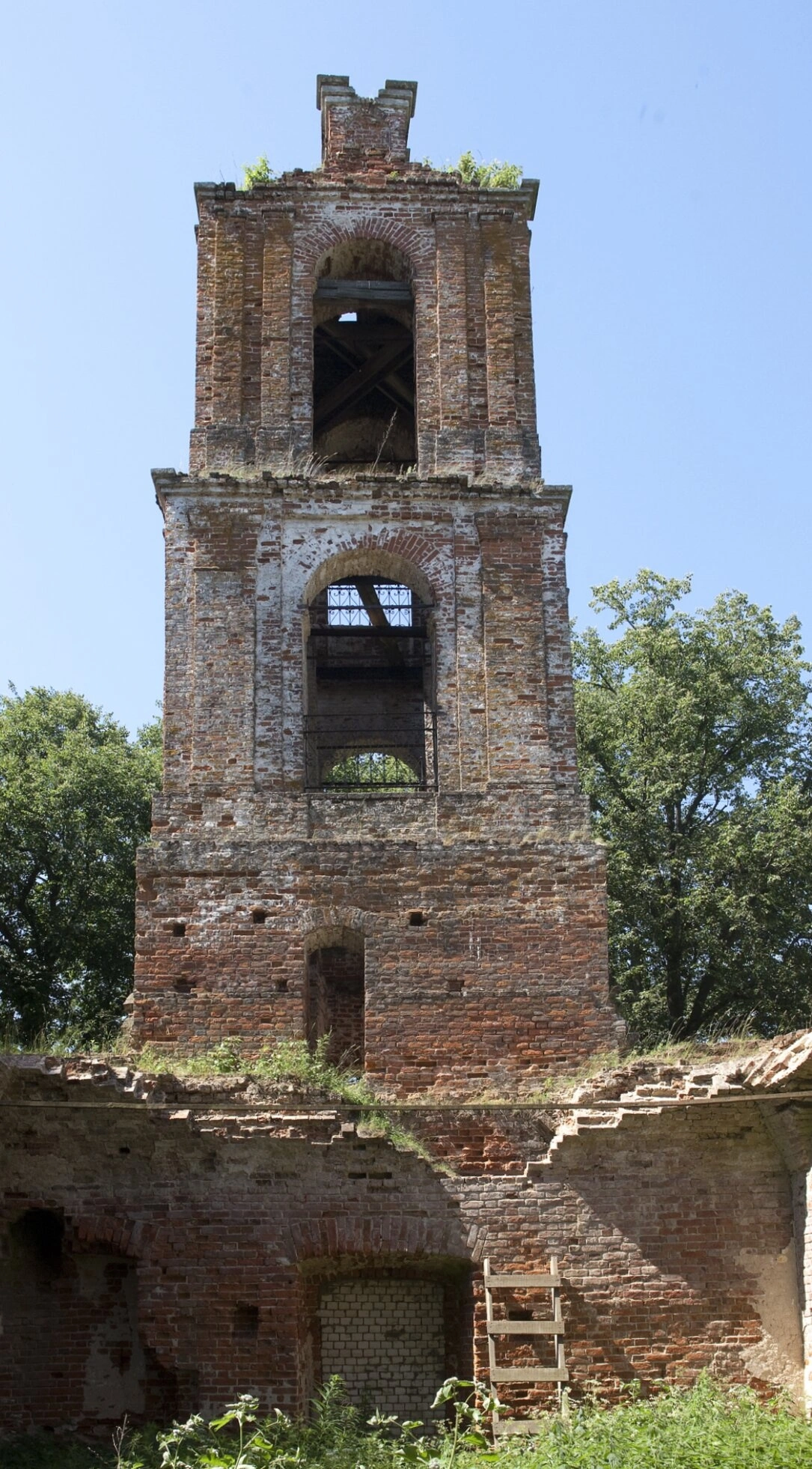 Архитектурный облик колокольни, выполненной в стиле классицизма, несёт на себе отпечаток былой красоты и благолепия. Трёхъярусное сооружение, увенчанное некогда шпилем, возвышается над окружающей местностью, напоминая о минувших днях и духовном значении этого места. Однако нынешнее её состояние вызывает глубокую скорбь: кирпичная кладка местами разрушена, оконные проёмы пусты, а завершение ярусов утрачено.