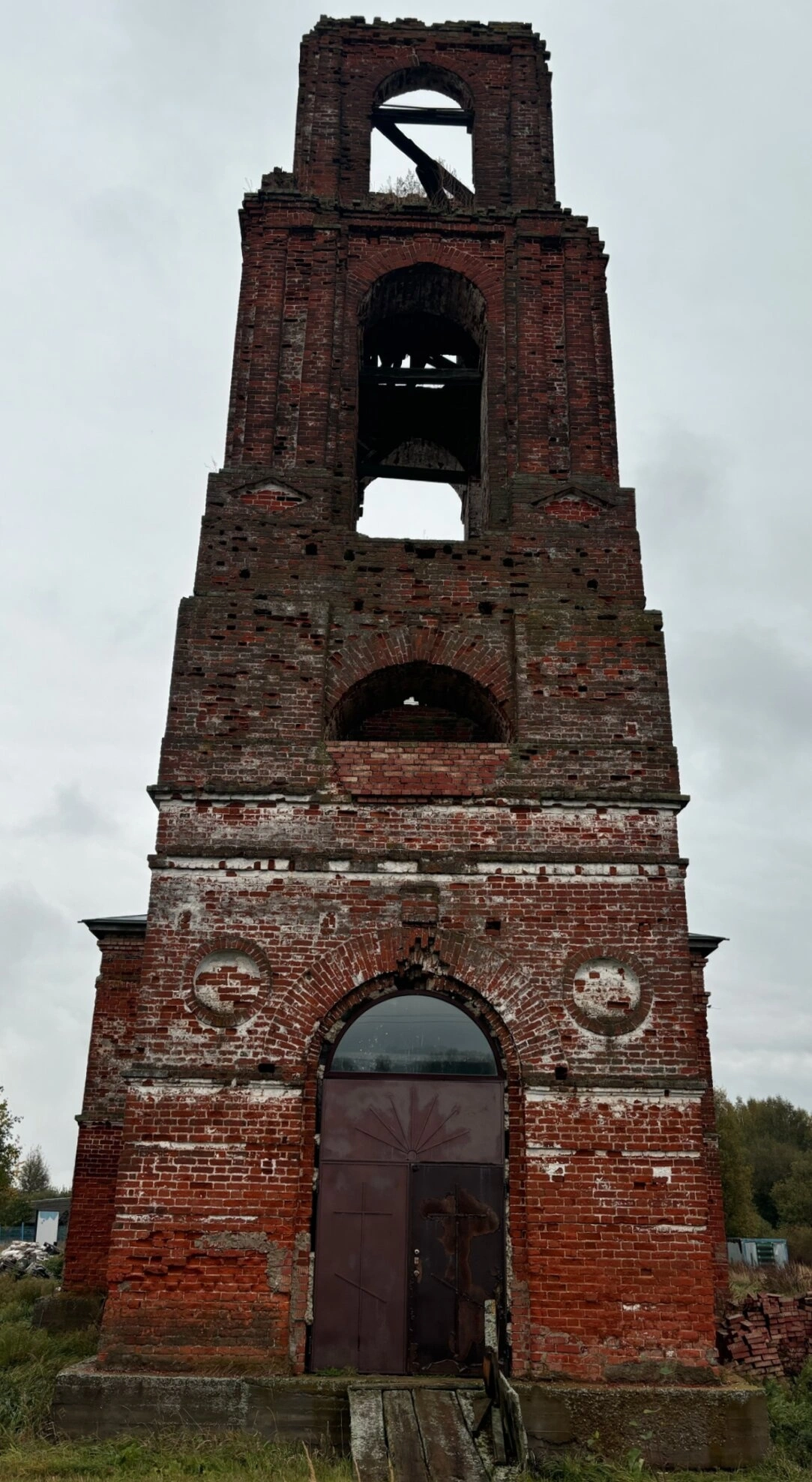 Состояние памятника вызывает глубокую скорбь. Кирпичная кладка, местами некогда оштукатуренная, сильно выветрена, видны глубокие трещины и следы разрушения. От белого защитного слоя остались лишь фрагменты, обнажившие материал стен. Забвение и действие времени неумолимо накладывают свой отпечаток на святыню. На заднем плане фотографии видны кроны деревьев и серое небо, что усиливает чувство утраты и запустения. В левой части кадра различимы детали старой ограды, также пребывающие в небрежении.