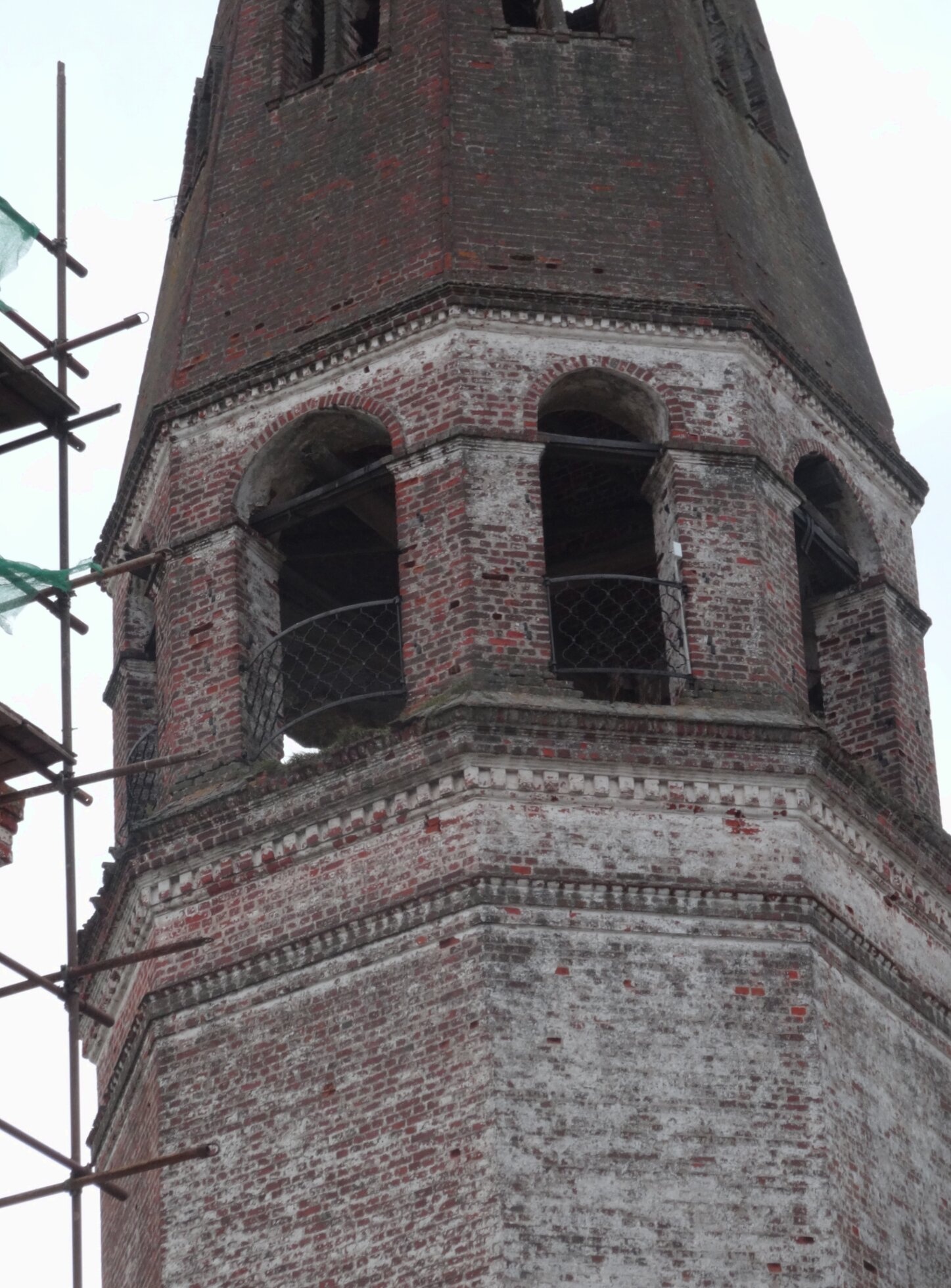 Величественная кирпичная кладка колокольни демонстрирует характерные для церковного зодчества элементы: арочные проёмы, которые в прошлом служили звонницами для церковных колоколов, призывавших верующих на молитву. Частично сохранившиеся металлические ограждения в проёмах подчёркивают монументальность и строгость форм сооружения. Фрагментарно уцелевшие следы побелки или штукатурки на кирпичных стенах позволяют предположить первоначальный облик святыни в былые времена.