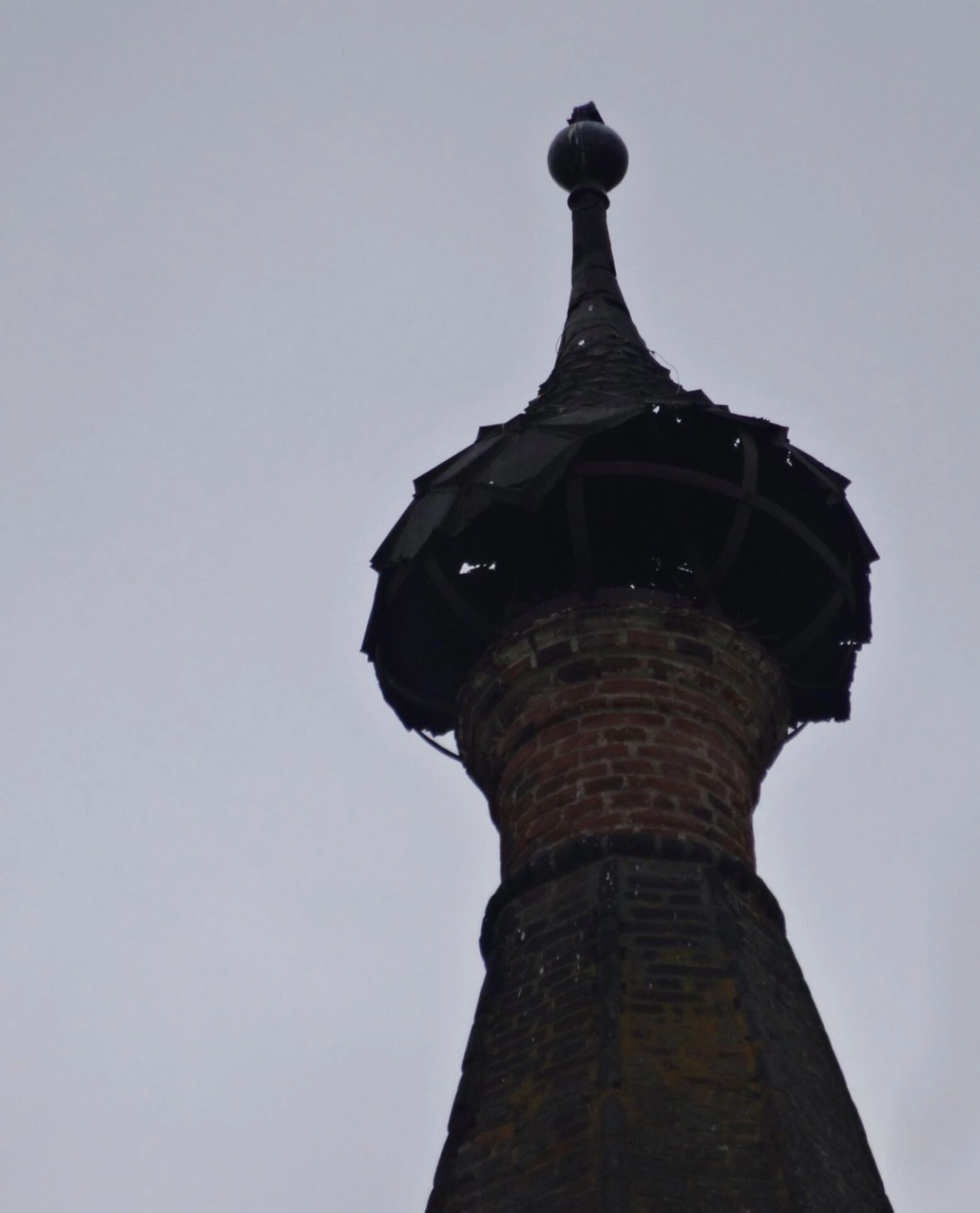 Основание колокольни, выполненное из добротного кирпича, демонстрирует традиции русского церковного зодчества. Над ним возносится ажурный металлический шпиль, являющий собой образец кузнечного искусства. Шпиль увенчан золочёным православным крестом, который символически указывает на небеса и напоминает о искупительной жертве Спасителя. Под крестом размещён декоративный шар-яблоко, олицетворяющий державу — символ власти Христа.