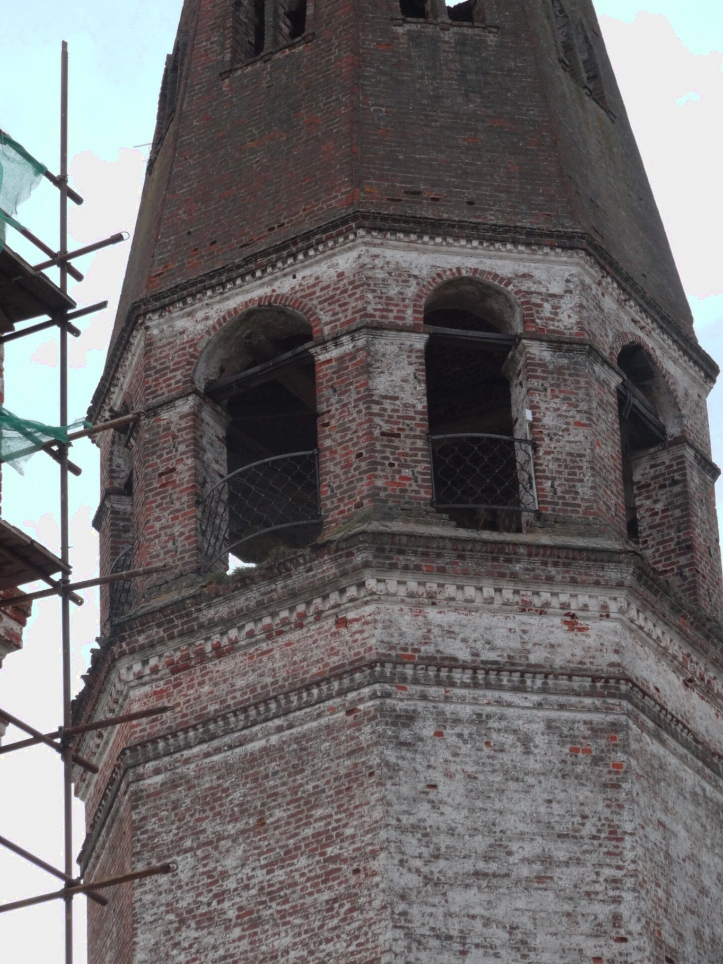 Колокольня представляет собой многоярусное сооружение, выполненное из красного кирпича с элементами декоративного оформления фасадов. На фотографии хорошо видны фрагменты кирпичной кладки с частично обвалившимися участками, а также арочные проёмы, которые в прошлом служили звонными окнами. В некоторых проемах сохранились элементы кованых решеток, свидетельствующие о высоком мастерстве кузнецов того времени.