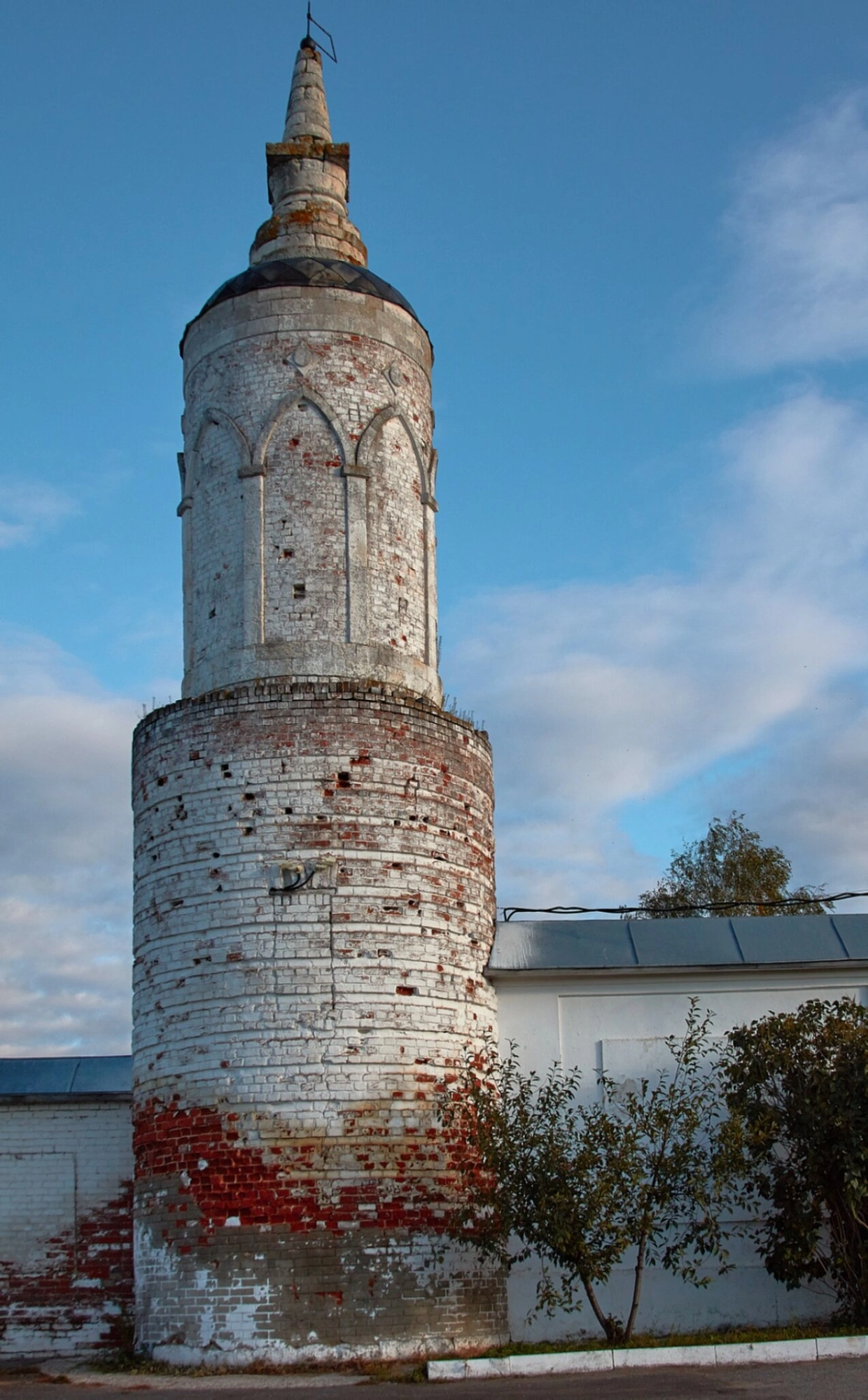 Колокольня представляет собой монументальное кирпичное сооружение цилиндрической формы, характерное для традиционного русского храмового зодчества. Особый интерес представляет различие в отделке ярусов сооружения: нижняя часть, вероятно относящаяся к более раннему периоду, сложена из красного кирпича с последующей побелкой, тогда как верхний ярус отличается изящными арочными проемами, предназначенными для оптимального распространения колокольного звона. Венчает сооружение стройный конический шпиль, увенчанный православным крестом, символизирующим веру и надежду.