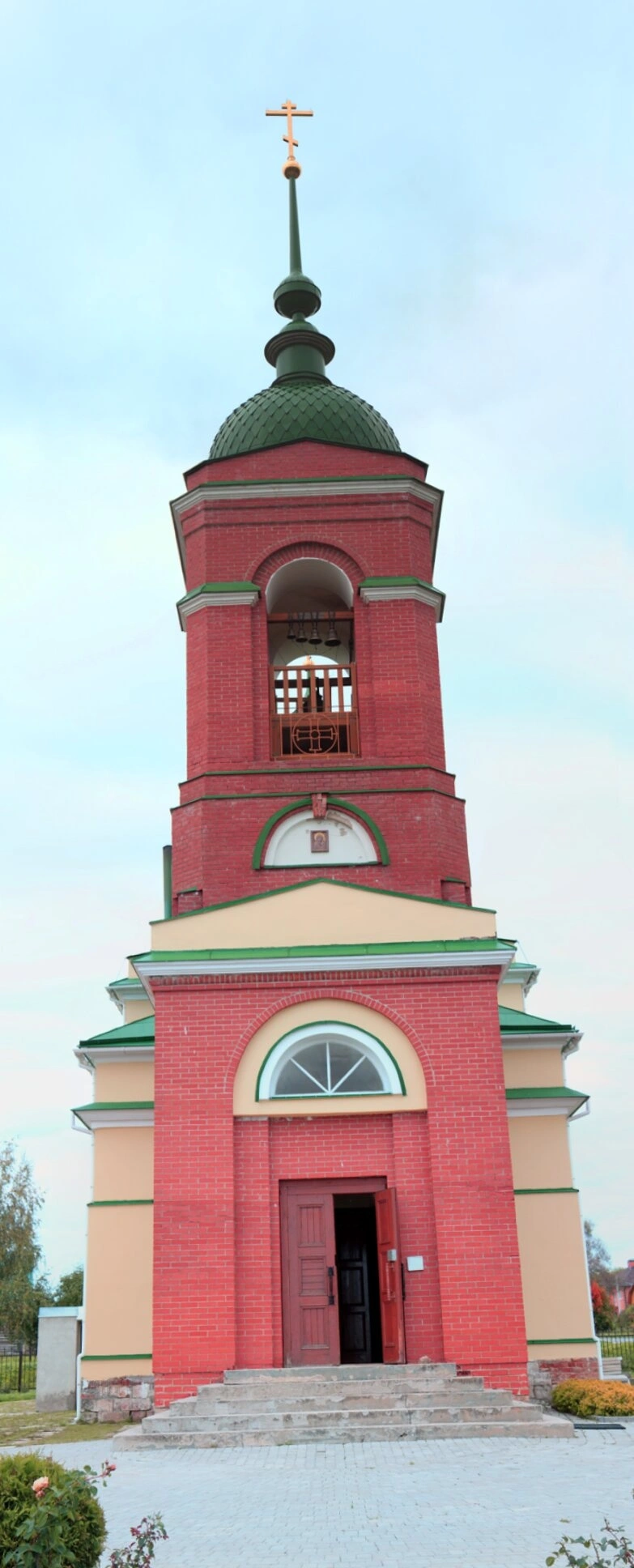 Нижний ярус колокольни выполнен из оштукатуренных светлых стен, что создаёт выразительный контраст с кирпичной кладкой верхних ярусов. Такое архитектурное решение типично для храмовых построек данного периода и подчёркивает вертикальную динамику сооружения. Колокольня является неотъемлемой частью храмового комплекса и выполняет важную функцию в православной традиции - созывает верующих на богослужение.