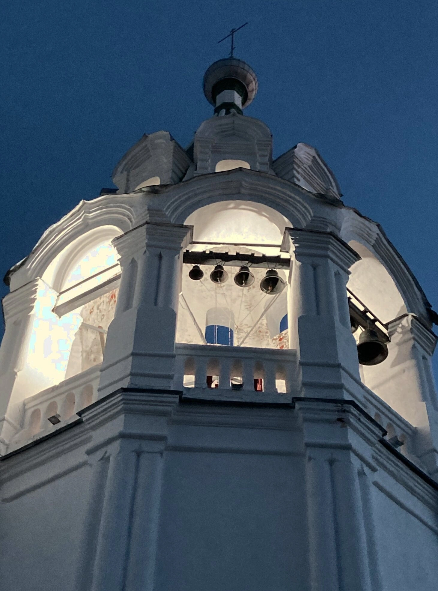 Верхние ярусы колокольни богато украшены декоративными элементами: пилястрами, карнизами и килевидными завершениями арок, что характерно для храмового зодчества Вологодчины. На фото хорошо видны сами колокола, предназначенные для созыва верующих на богослужение и возвещающие о важнейших моментах церковной жизни.