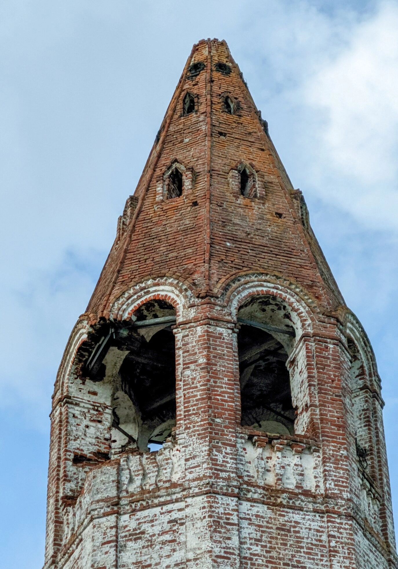 Особого внимания заслуживают небольшие слуховые окна, расположенные в гранях шатра. Эти арочные проемы не только выполняют практическую функцию освещения внутреннего пространства колокольни, но и придают всему сооружению особую легкость и устремленность вверх. Голубое небо с кучевыми облаками на заднем плане создает возвышенный образ, контрастирующий с земной твердыней древней постройки.