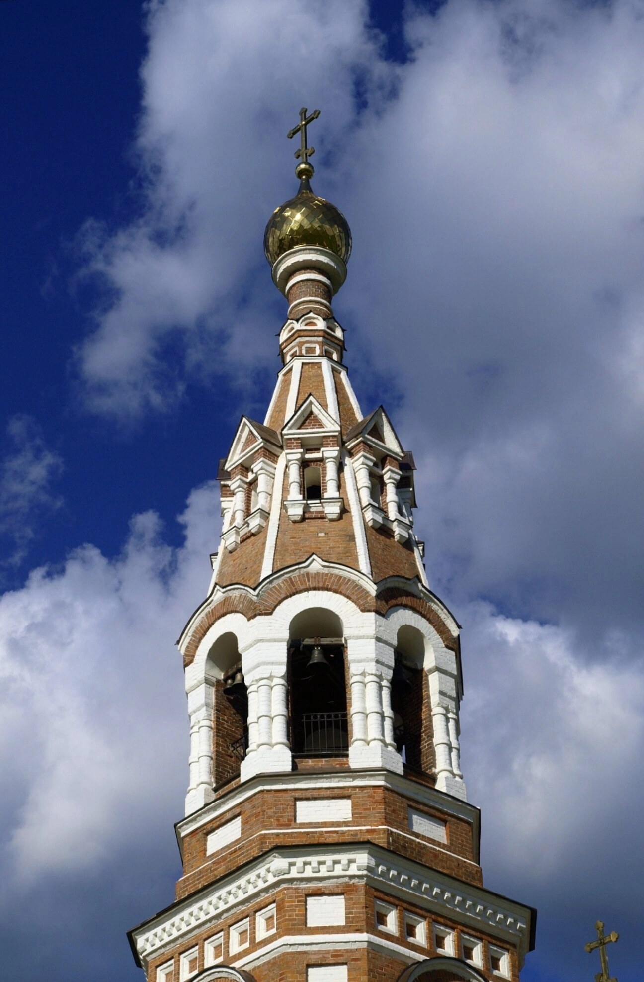 На представленной фотографии запечатлена колокольня храма в честь святого Архистратига Михаила, расположенного в селе Красное Боровского района Калужской области. Снимок демонстрирует верхнюю часть колокольни, выполненную в традициях псевдорусского стиля, характерного для церковного зодчества конца XIX века.