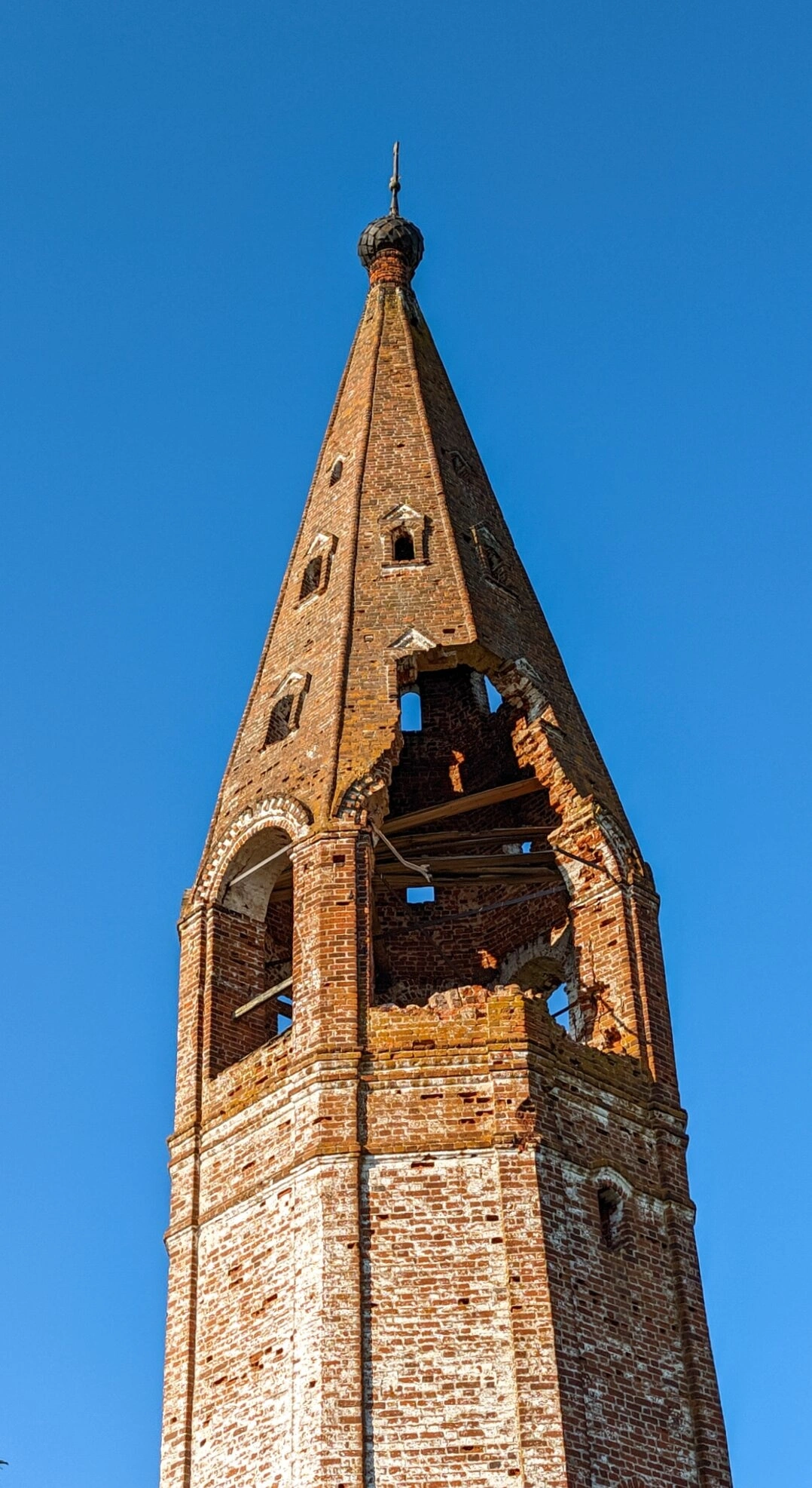 На самой вершине колокольни сохранился небольшой купол, увенчанный православным крестом, который символизирует победу жизни над смертью и напоминает о духовном предназначении данного строения. Несмотря на видимые следы разрушения и выветривания кирпичной кладки, а также частичное обнажение внутренних деревянных перекрытий, колокольня сохраняет своё величие и духовную значимость.