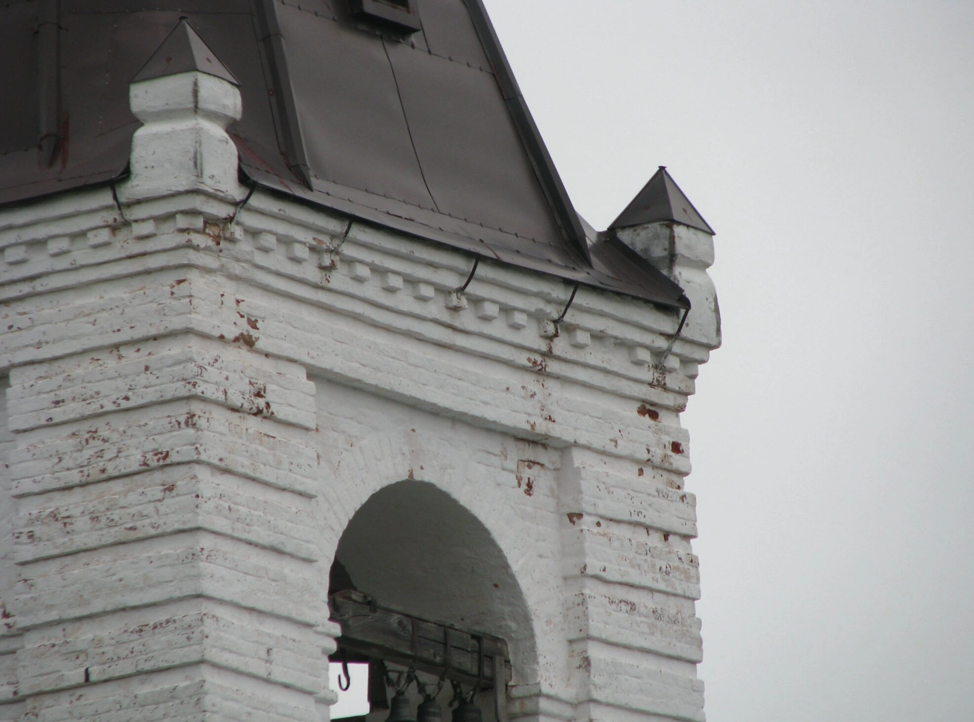Четверик колокольни выполнен из добротного белого камня и украшен скромным, но изящным декором: углы подчеркнуты лопатками, а по завершению яруса проходит профилированный карниз. В арочных проемах, предназначенных для распространения благовеста, виднеются колокола – главные инструменты церковного звонаря, чей звук созывает православных на молитву.