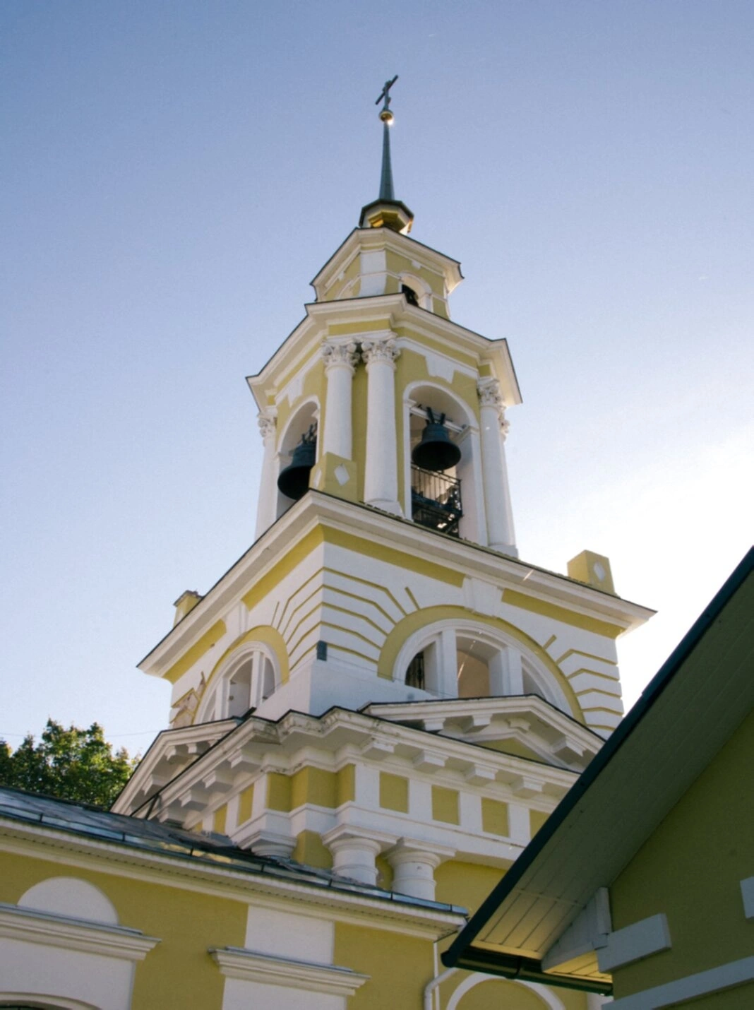 Колокольня, выполненная в благолепном сочетании белого и жёлтого цветов, представляет собой выдающийся образец православной храмовой архитектуры. Её ярусная конструкция завершается изящным шпилем, который венчает святой крест — символ спасения и искупления. В арочных проёмах звонницы размещены колокола, призывающие верующих на богослужение своим благозвучным перезвоном.