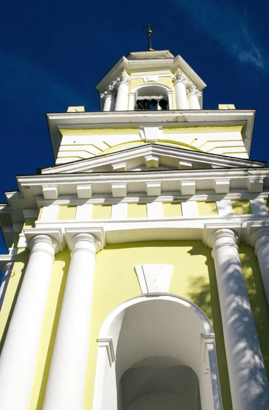 На представленной фотографии запечатлена величественная колокольня Храма Святителя Николая Чудотворца, что расположена в селе Белое Московской области. Это архитектурное сооружение является ярким образцом православного зодчества периода классицизма, отличающегося строгостью форм, симметрией и гармонией пропорций.