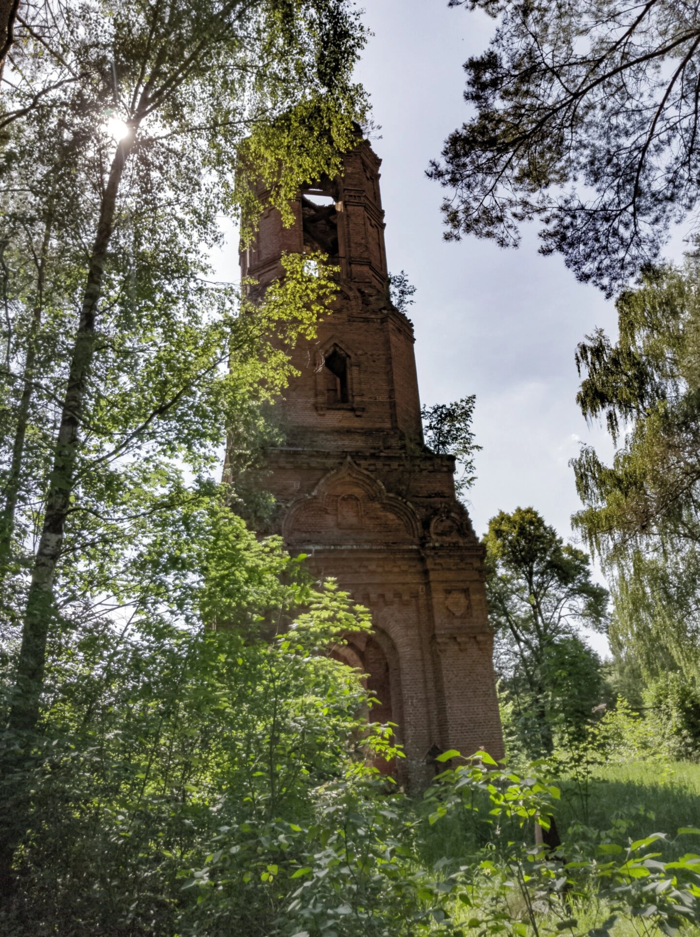 Колокольня выполнена из красного кирпича и демонстрирует характерные элементы православной храмовой архитектуры. На фотографии хорошо просматриваются остатки арочных проёмов и оконных конструкций, где ранее размещались церковные колокола. Верхняя часть сооружения значительно повреждена, что свидетельствует о длительном периоде запустения этого святого места.
