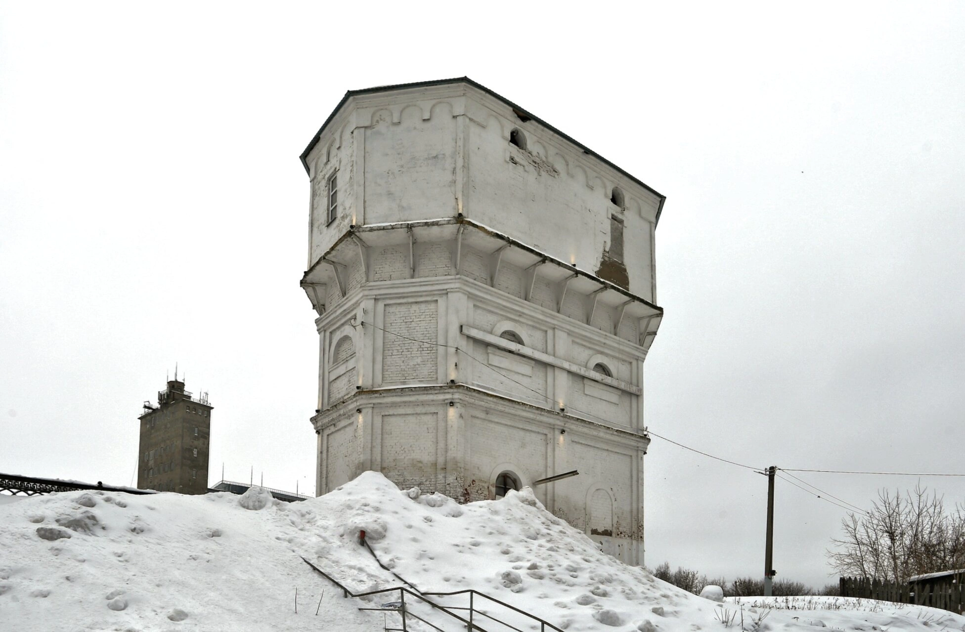Белоснежные стены колокольни, сохранившие следы времени, символизируют духовную чистоту и непреходящую ценность православной веры. На заднем плане просматривается ещё одно сооружение, которое, согласно историческим данным, является водонапорной башней, расположенной на Привокзальной площади города Шуи. Храм Петра и Павла, колокольня которого изображена на фотографии, имеет богатую историю и является важным духовным центром для православных верующих Шуйского края.