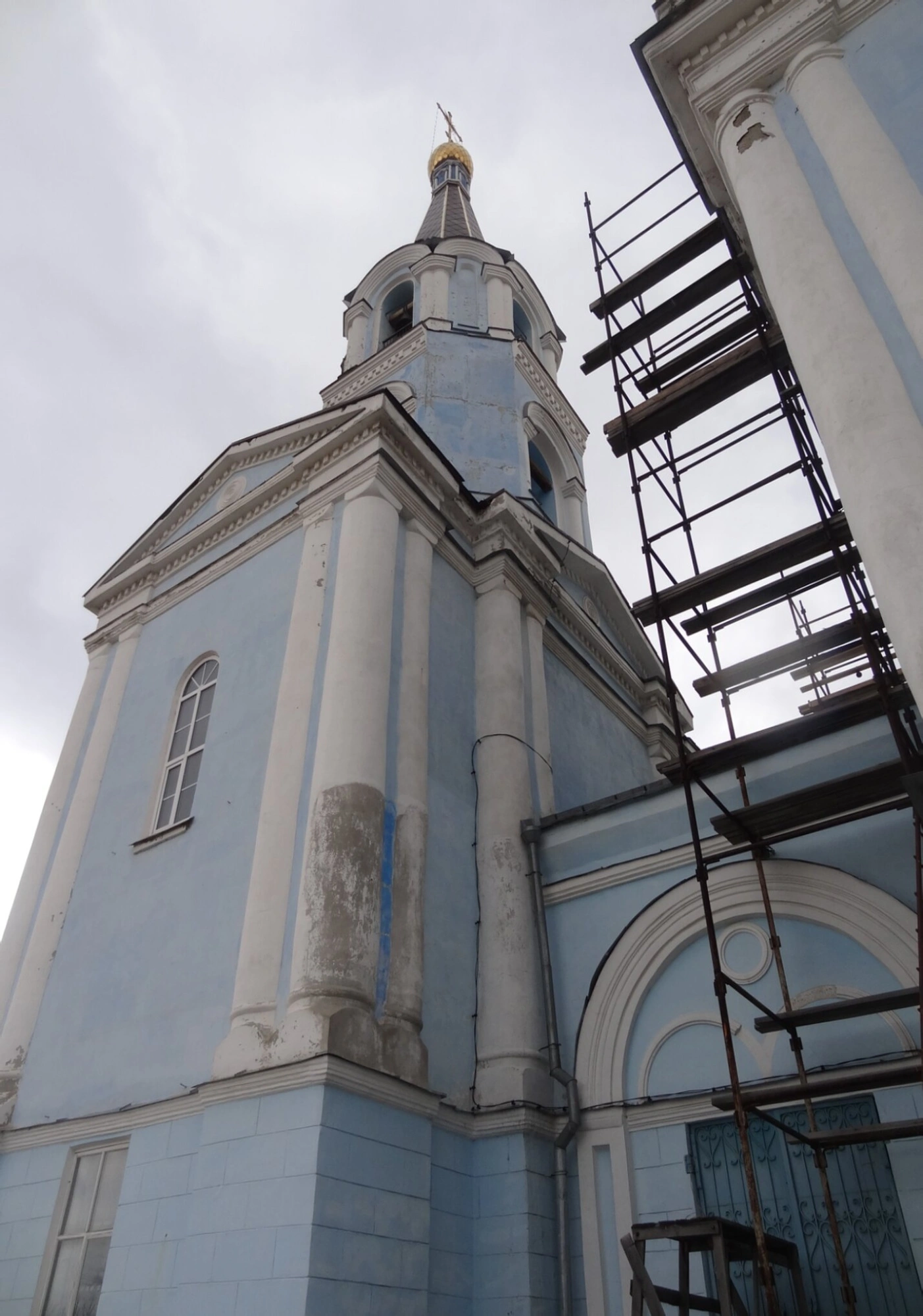 Важным элементом, попавшим в кадр, являются строительные леса, установленные сбоку от здания. Это свидетельствует о проведении ремонтно-реставрационных работ, направленных на сохранение уникального исторического облика храма для будущих поколений. Данные мероприятия подчёркивают непреходящее значение святыни как центра духовной жизни города.