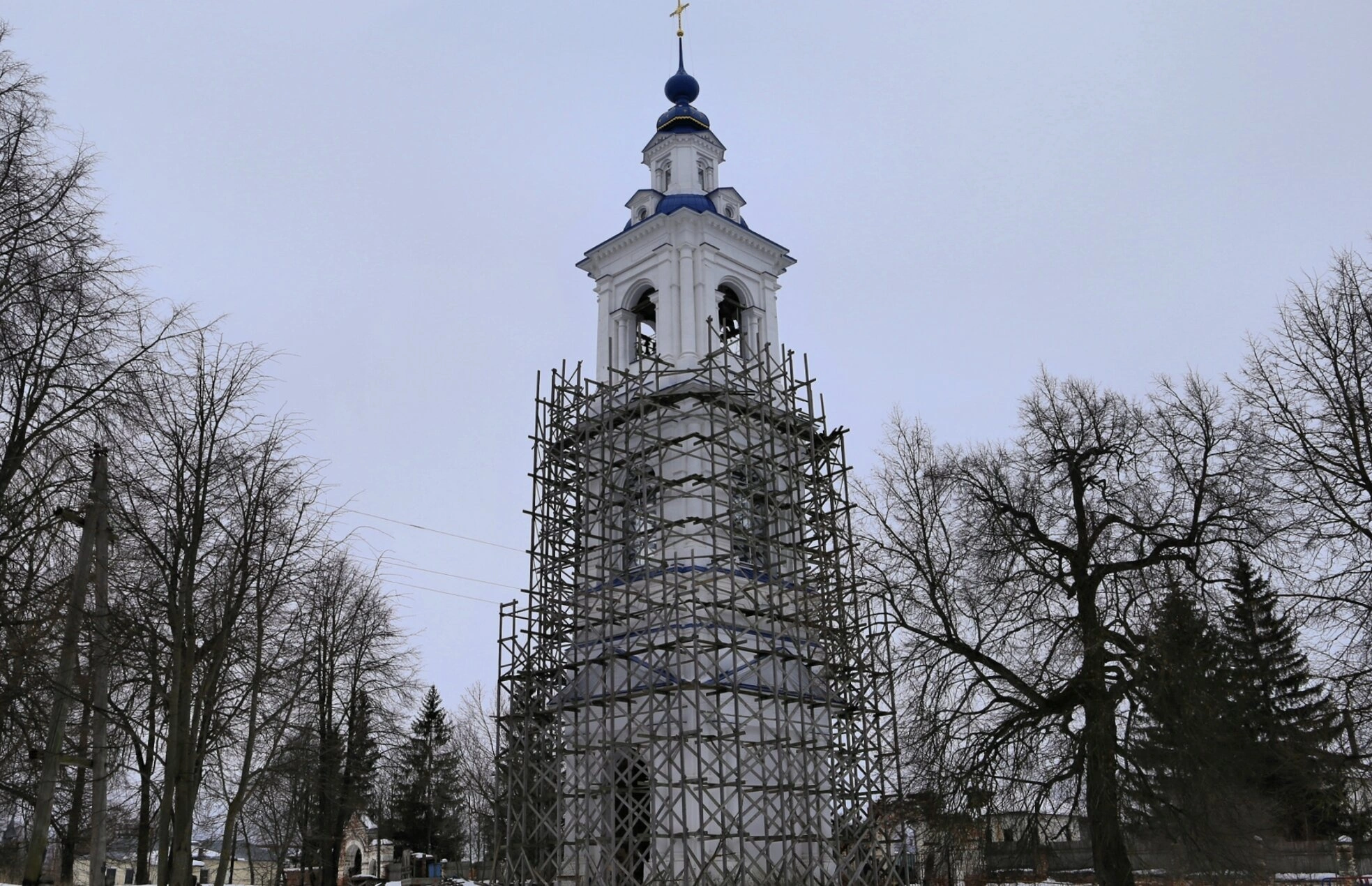 В момент съёмки колокольня находилась на реставрации, о чём свидетельствуют установленные вокруг неё строительные леса. Это важный этап в сохранении исторического облика православной святыни. Колокольня имеет несколько ярусов и увенчана синим куполом с установленным на нём православным крестом, символизирующим веру и надежду.