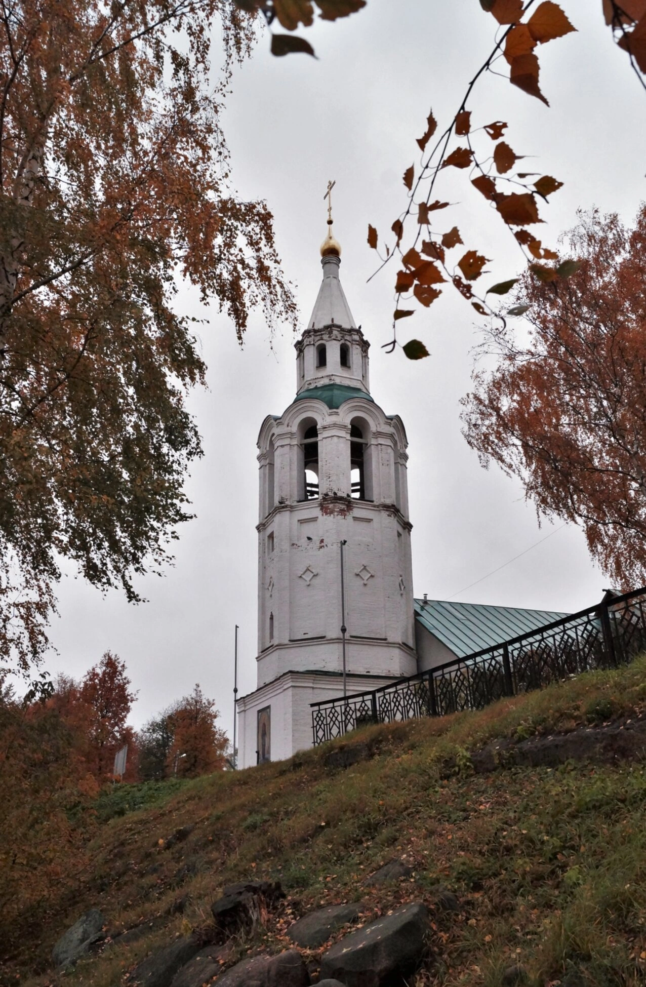 Храмовый комплекс, частью которого является эта колокольня, имеет богатую историю, связанную с ярославской землёй. Вид на колокольню с опавшей листвой на переднем плане и серым осенним небом наводит на мысли о быстротечности времени и вечности веры, которая сохраняется в таких святых местах, как этот старинный ярославский храм.