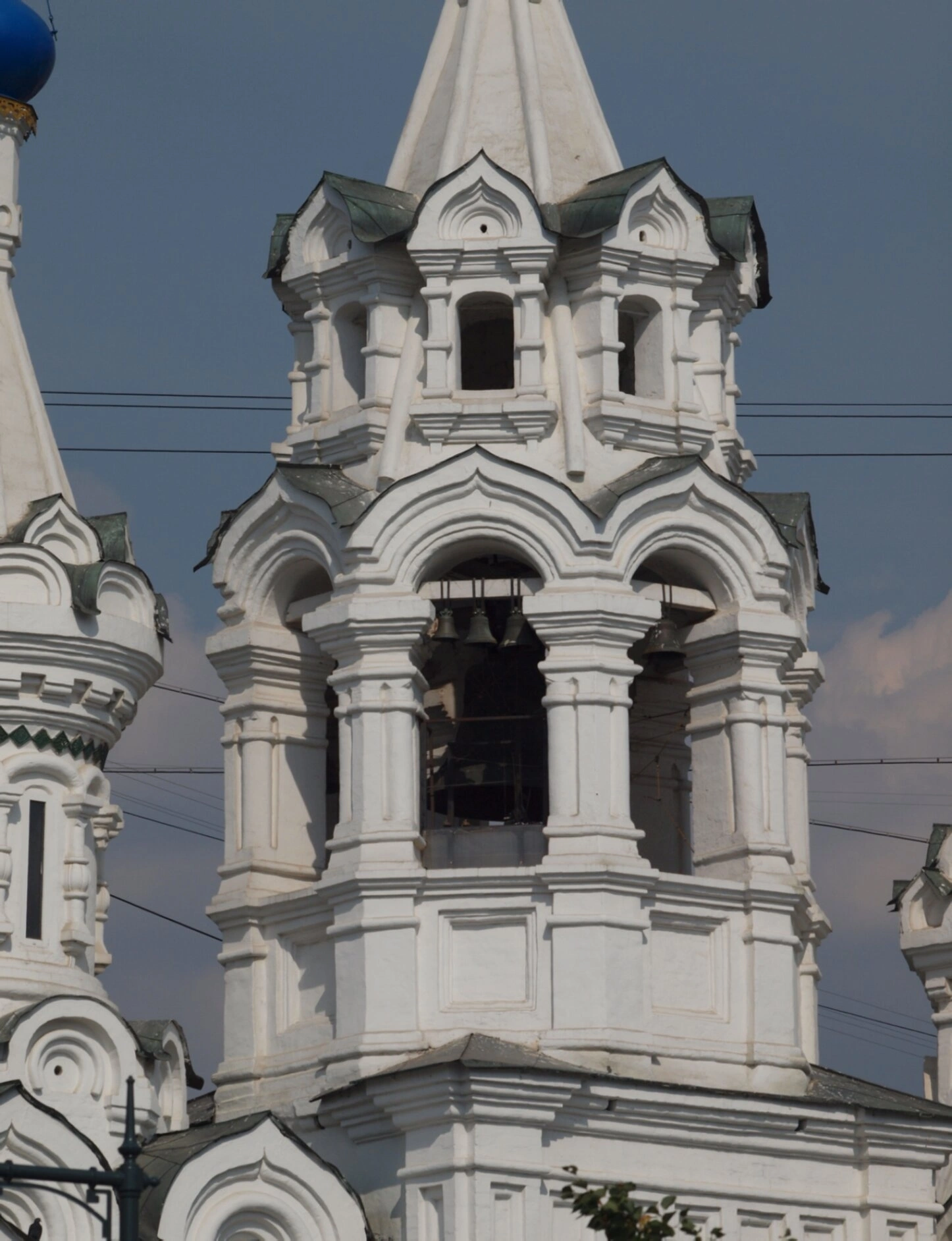 Средний ярус колокольни выполнен в форме восьмерика и украшен четырьмя узкими арочными окнами, которые обеспечивают освещение внутреннего пространства. Фасады обильно декорированы традиционными элементами православной архитектуры: рядами кокошников, резными наличниками, сложными каменными узорами и ширинками. Завершает композицию высокий шатёр с аккуратно расположенными слуховыми окнами, увенчанный православным крестом.