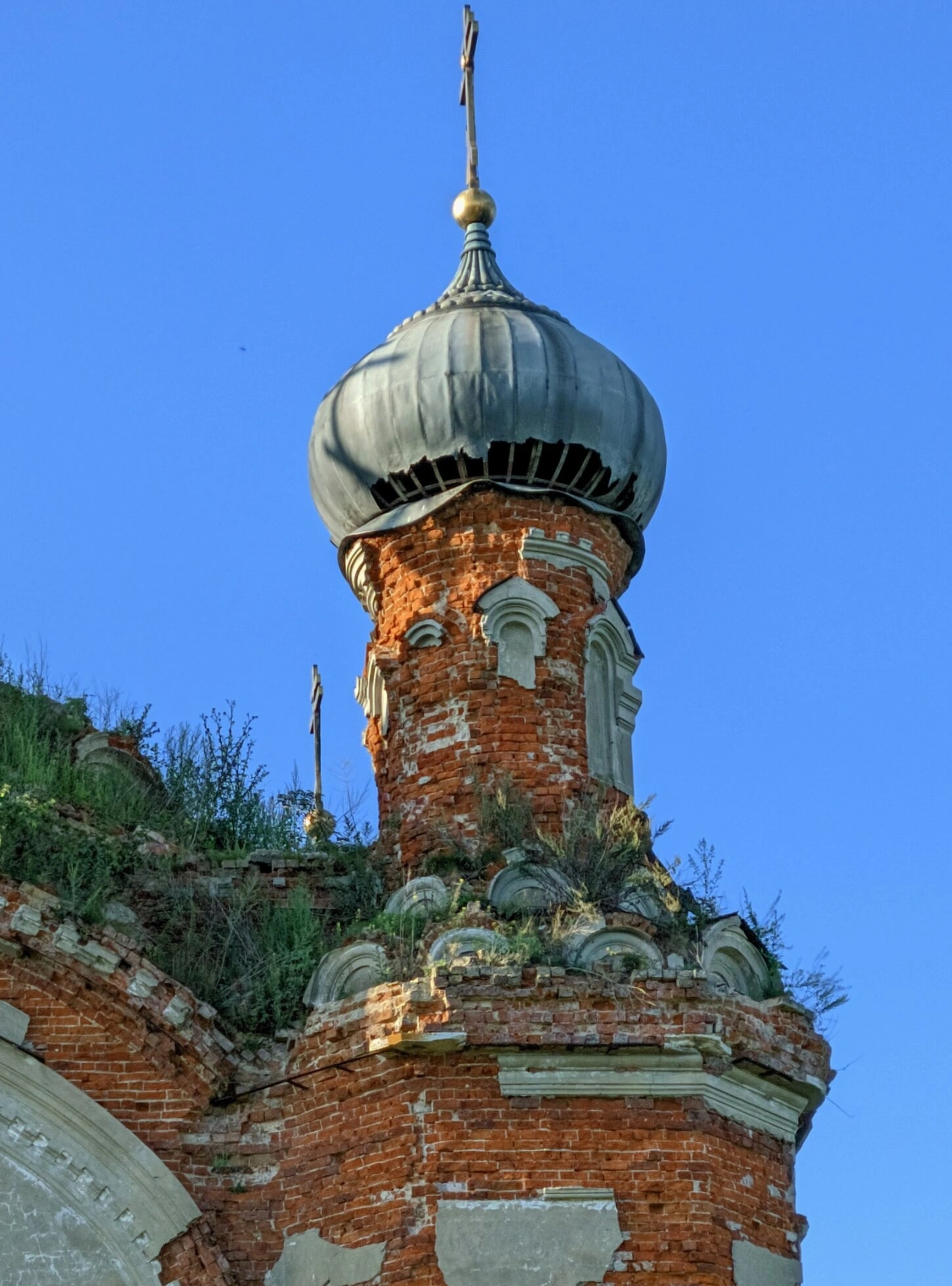 Венчает колокольню металлический купол, подвергшийся сильной коррозии и имеющий существенные повреждения. Несмотря на плачевное состояние конструкции, на вершине купола сохранился православный крест, символизирующий некогда действующий статус храма. На заднем плане фотографии просматривается еще один крест, вероятно принадлежащий основной части церковного здания.
