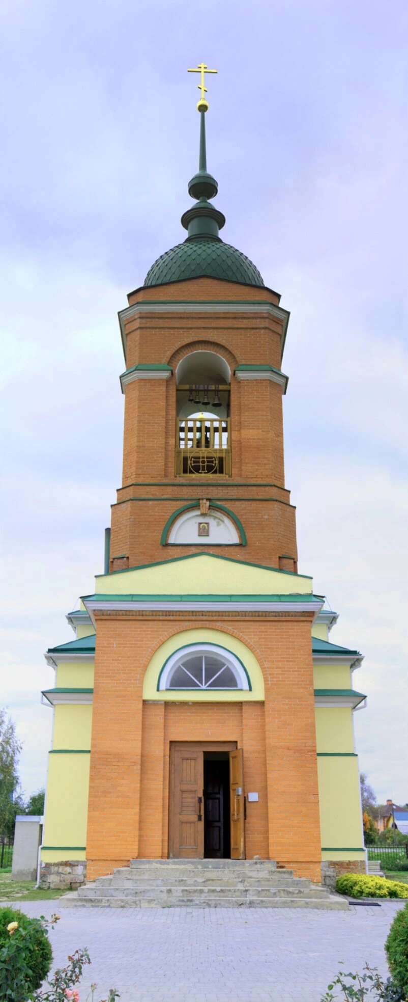 Венчает колокольню зелёный купол-луковица, символизирующий пламя свечи и устремление верующих к небесам. Купол переходит в высокий шпиль, увенчанный позолоченным крестом — символом искупительной жертвы Христа. Цветовое решение сооружения сочетает красный кирпич, светло-жёлтую штукатурку стен и зелёные кровельные покрытия, что создает гармоничный архитектурный образ.