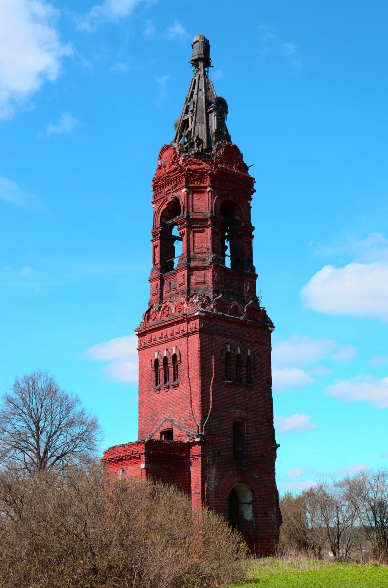 На представленной фотографии запечатлена колокольня бывшей церкви Рождества Пресвятой Богородицы, расположенная в деревне Языково Дмитровского района Московской области. Это трёхъярусное сооружение из красного кирпича, возведённое в начале XX века и являющееся ярким образцом православной храмовой архитектуры того периода.