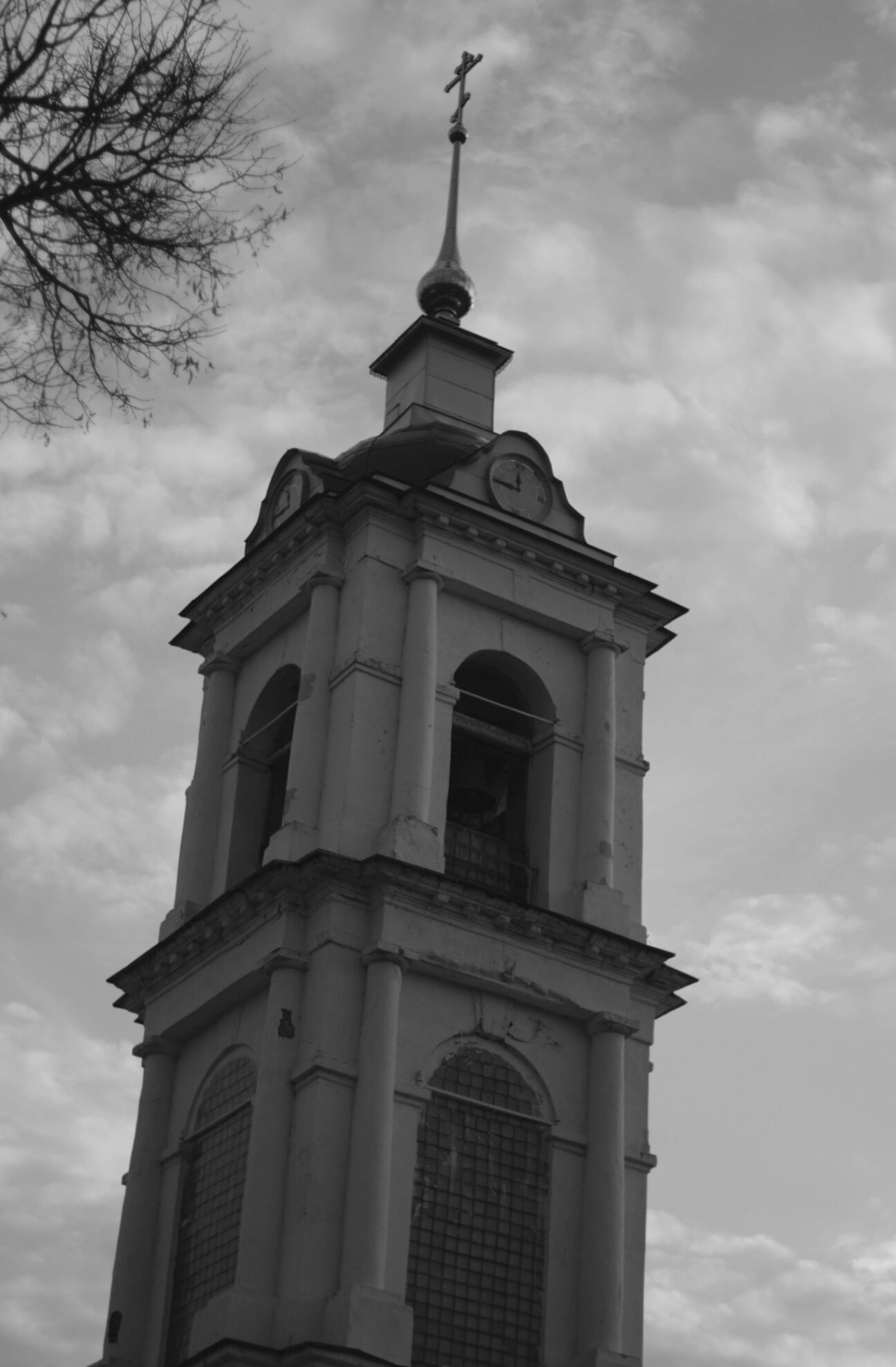 На заднем плане фотографии видно облачное небо и ветви голого дерева, что создаёт определённое настроение и подчёркивает время года. Ракурс съёмки снизу вверх позволяет оценить монументальность сооружения и его духовную символику.