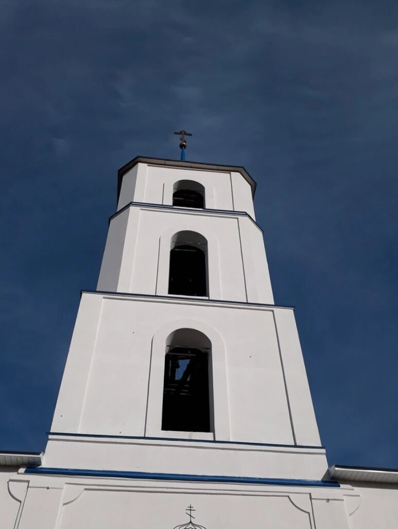 Архитектура колокольни исполнена в лучших традициях русского церковного зодчества. Каждый ярус прорезан арочными проёмами, или звонами, предназначенными для церковных колоколов, благовест которых разносится над окрестными полями и сёлами. Декоративные элементы, выкрашенные в лазурный цвет, гармонично дополняют основной белый фон, создавая праздничный и нарядный облик. Венчает это сооружение массивный золочёный купол, над которым гордо возносится православный крест – символ спасения и победы жизни над смертью.