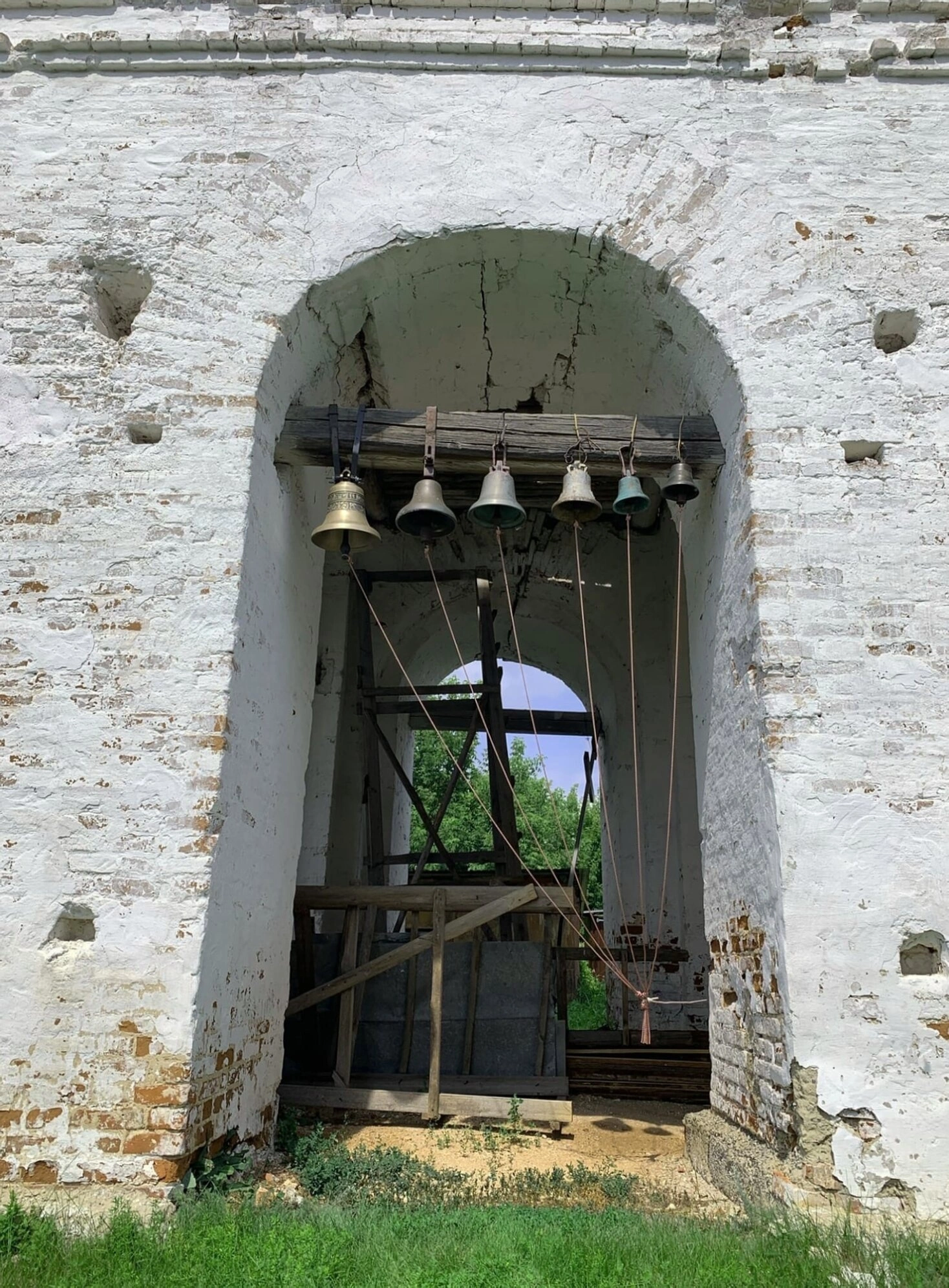 Массивная арка, сложенная из белого кирпича, представляет собой ярус звона — основу колокольни. Внутри арки на прочной деревянной балке подвешены колокола разного размера, предназначенные для созыва верующих на богослужение. Состояние кладки, на которой видны следы времени, наглядно свидетельствует о долгой и сложной истории храма, пережившего закрытие в безбожные десятилетия и последующее возрождение.