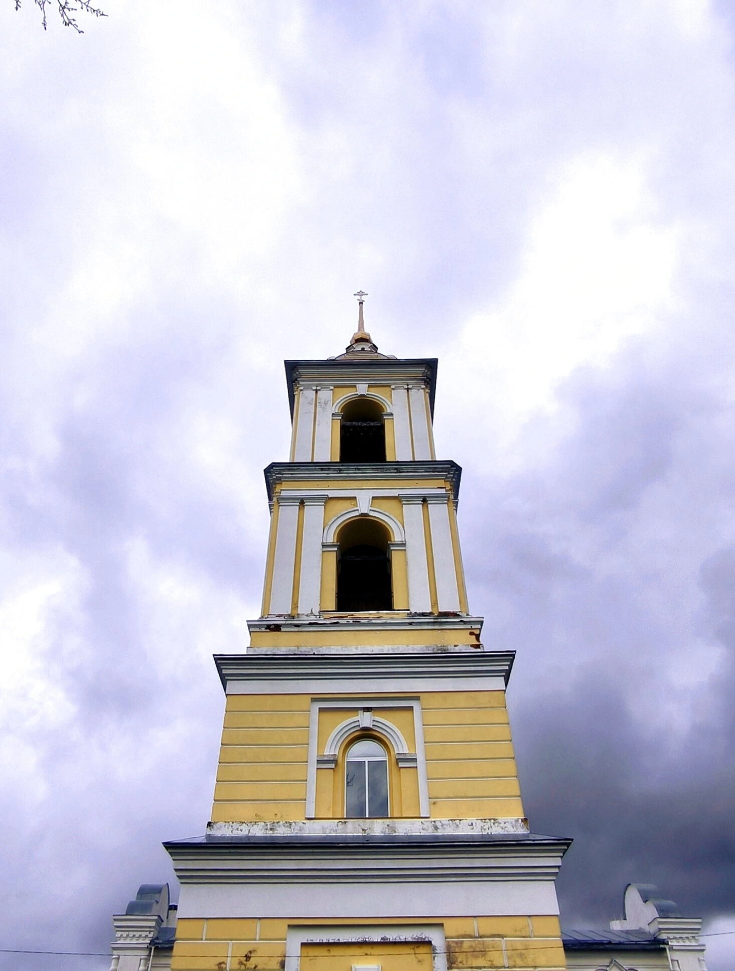 Колокольня выполнена в классическом архитектурном стиле, характерном для русского церковного зодчества. Многоярусная композиция сооружения демонстрирует традиционное для православных храмов построение: массивный нижний ярус плавно переходит в более легкие верхние уровни, завершающиеся изящным шпилем с водружённым на него православным крестом. Фасад колокольни окрашен в тёплый жёлтый цвет, который гармонично сочетается с белоснежными архитектурными элементами — карнизами, пилястрами и обрамлениями арочных проёмов.