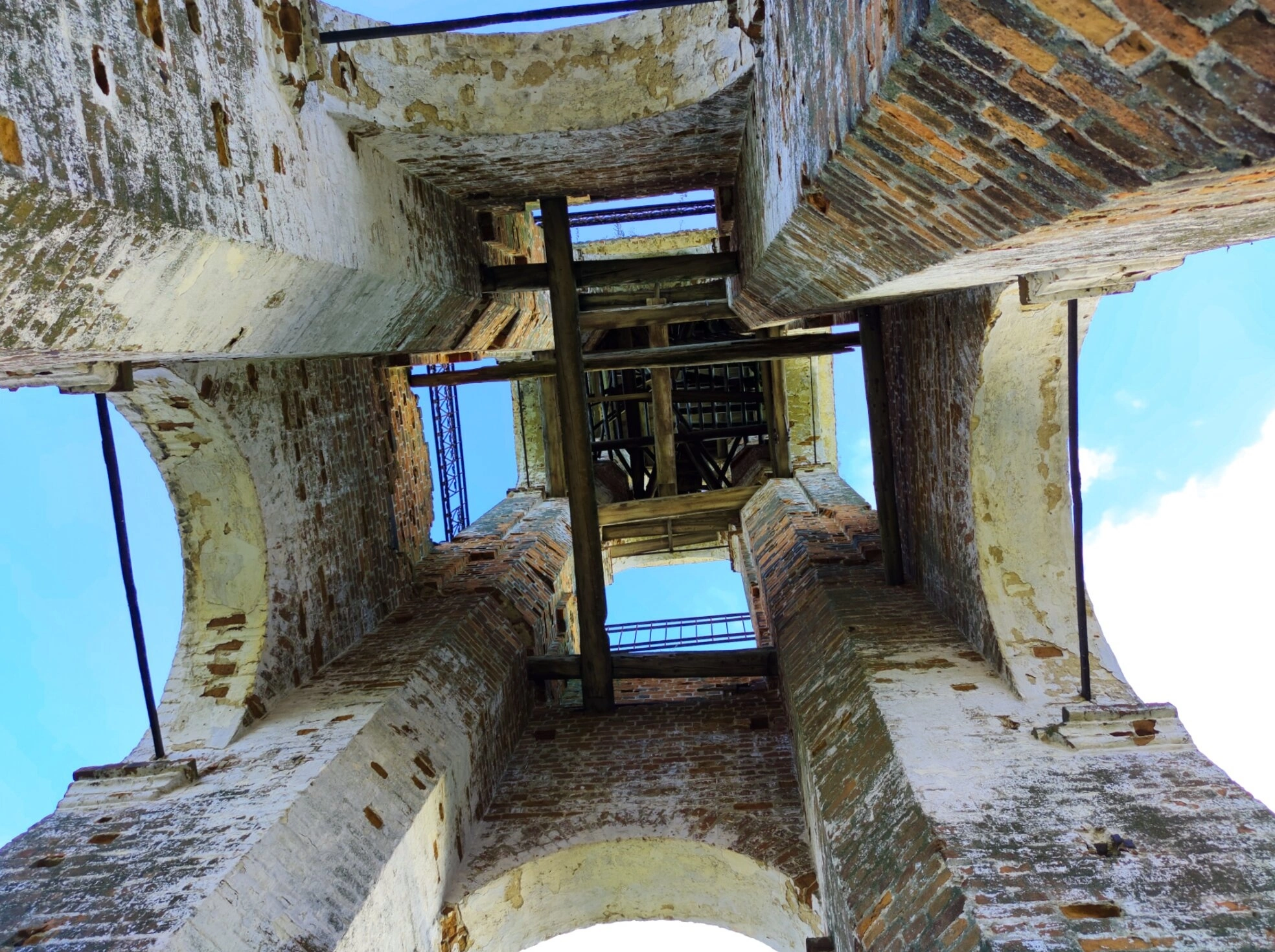 Фотография интерьера колокольни передаёт особую атмосферу этого места, где время словно остановилось. Арочные проёмы, устремлённые в небо, создают мощный вертикальный акцент, напоминая о молитвенном горении человеческой души к Богу. Даже в полуразрушенном состоянии это сооружение сохраняет величие и благодать, свойственные православным святыням.