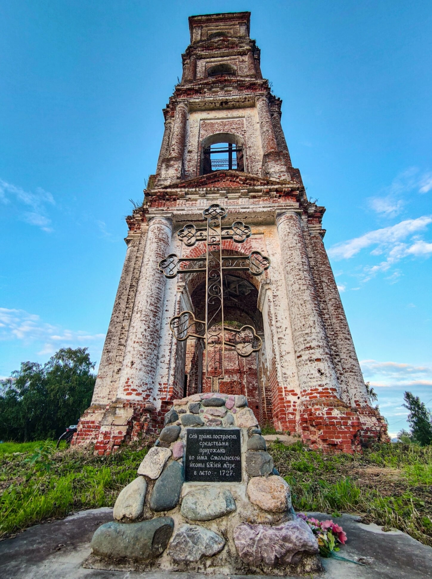 На фотографии запечатлена колокольня церкви в честь Смоленской иконы Божией Матери, расположенная в селе Армёнки Нерехтского района Костромской области. Это сохранившееся архитектурное сооружение является частью некогда величественного храмового комплекса, возведённого в 1727 году усердием и на средства прихожан.